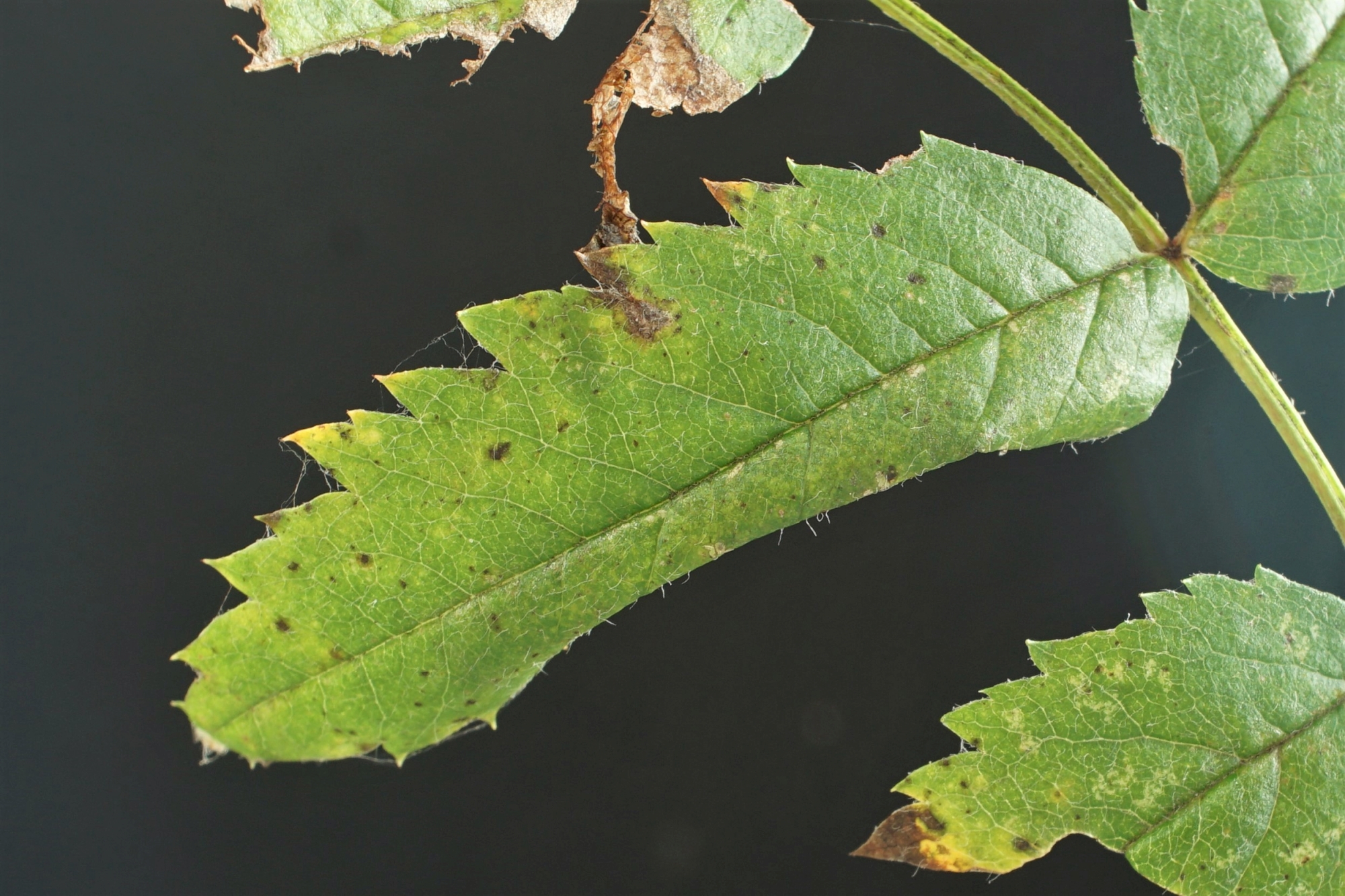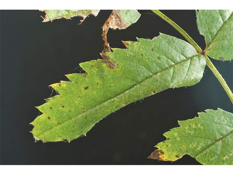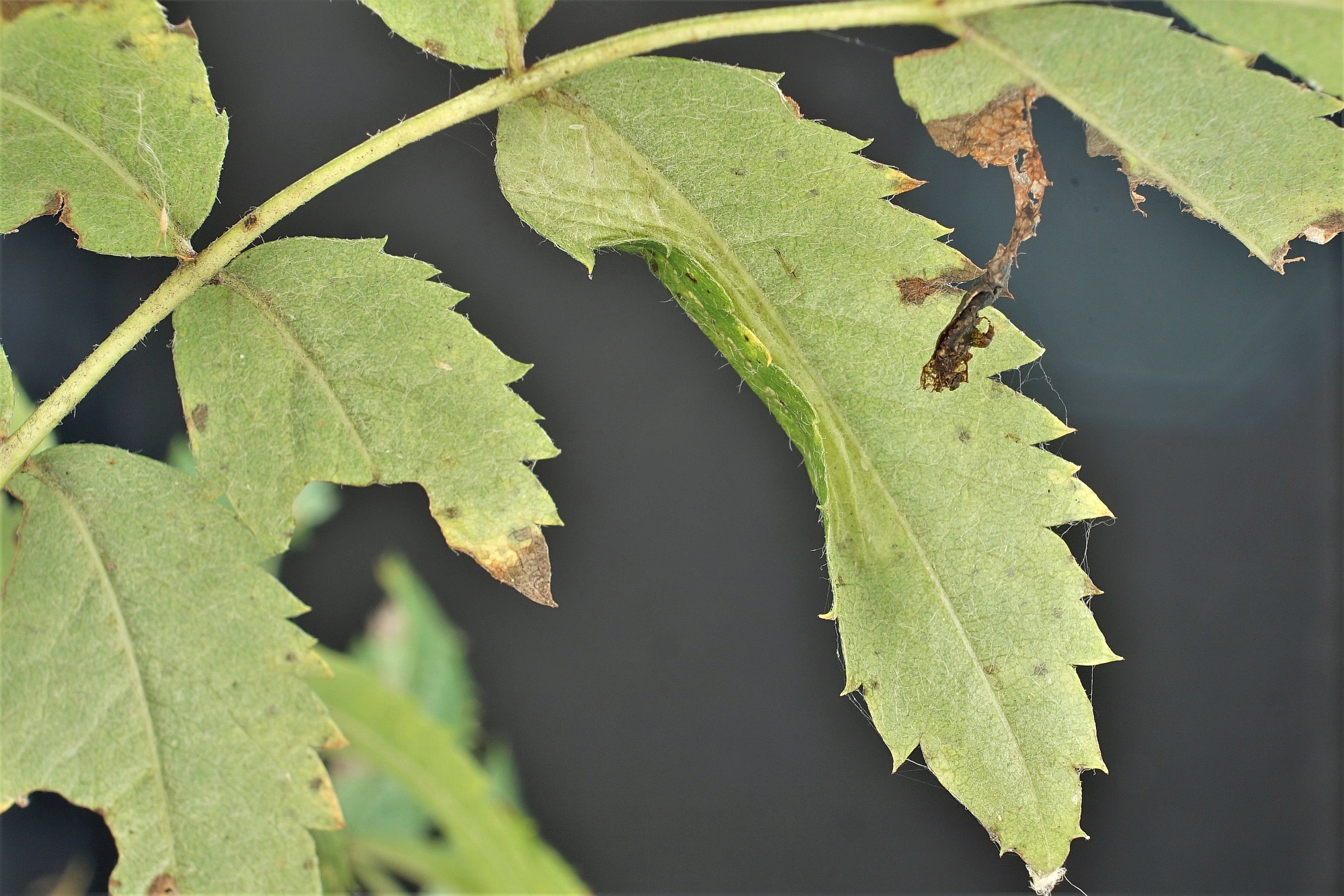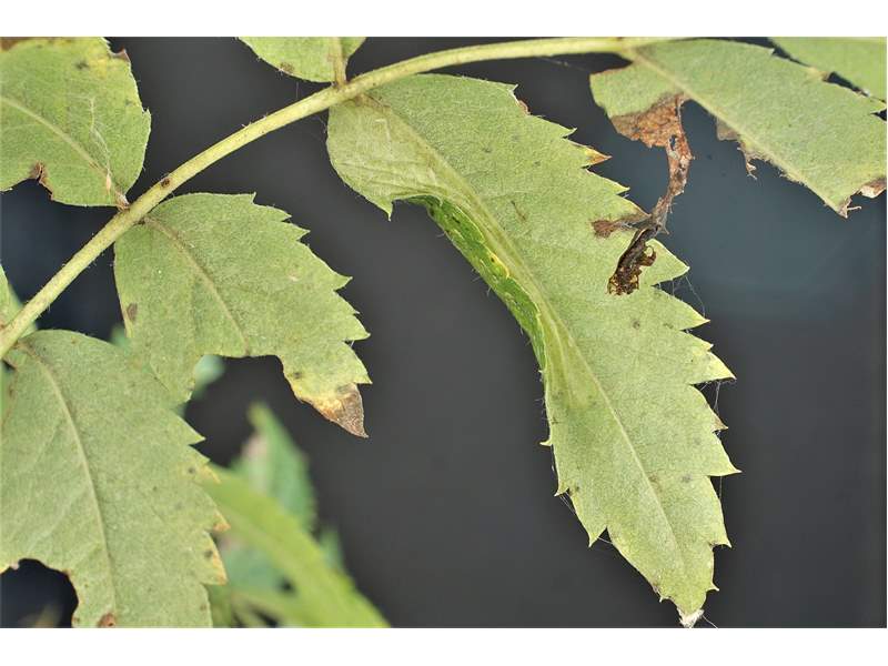 Unterseitige Faltenmine an Eberesche (Beispiel 3), Ansicht: Blattoberseite. Großdubrau, OT Crosta, 19.10.2020