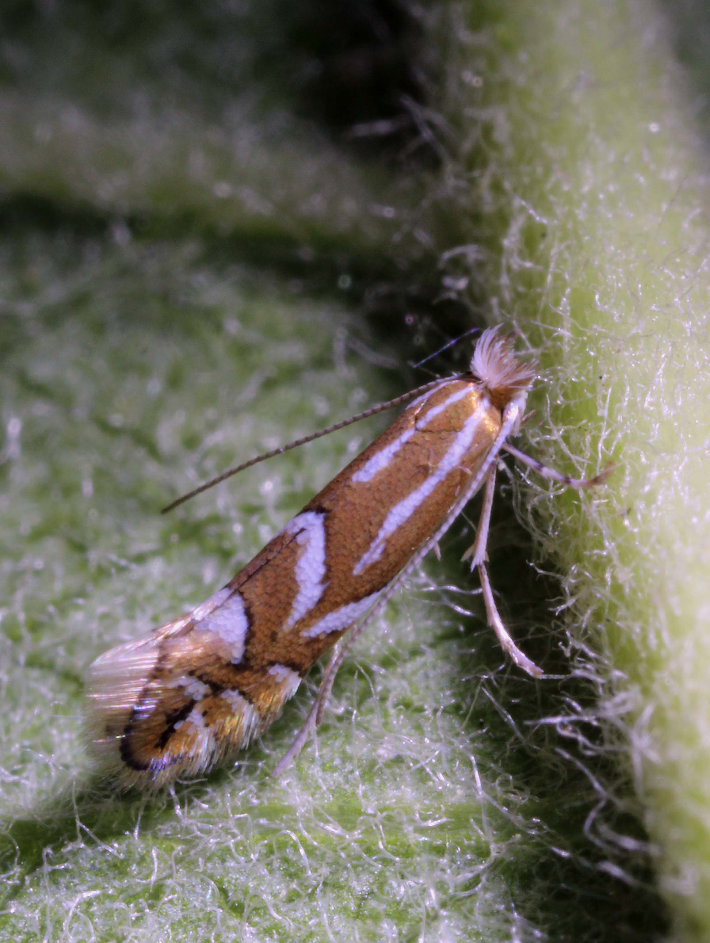 Die Larven erzeugen Faltenminen an den Blättern von Vogelkirsche (Prunus avium), Felsenkirsche, (Prunus mahaleb), Pfirsich (Prunus persica), Pflaume (Prunus domestica) und Kirschpflaume (Prunus cerasifera) (Nuss & Stübner 2000).