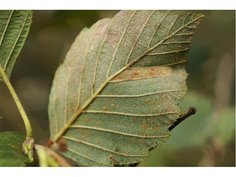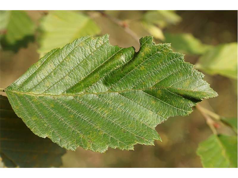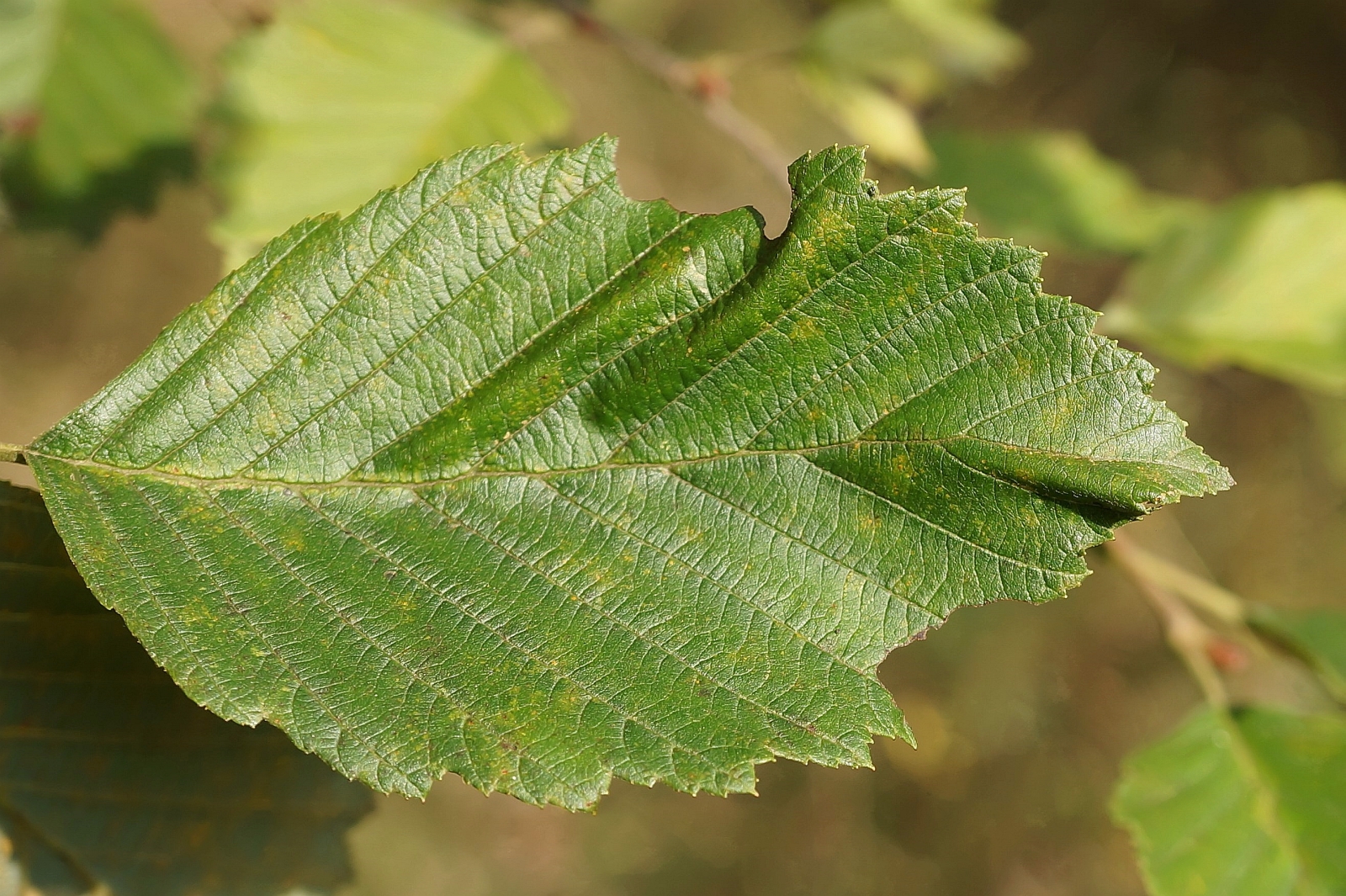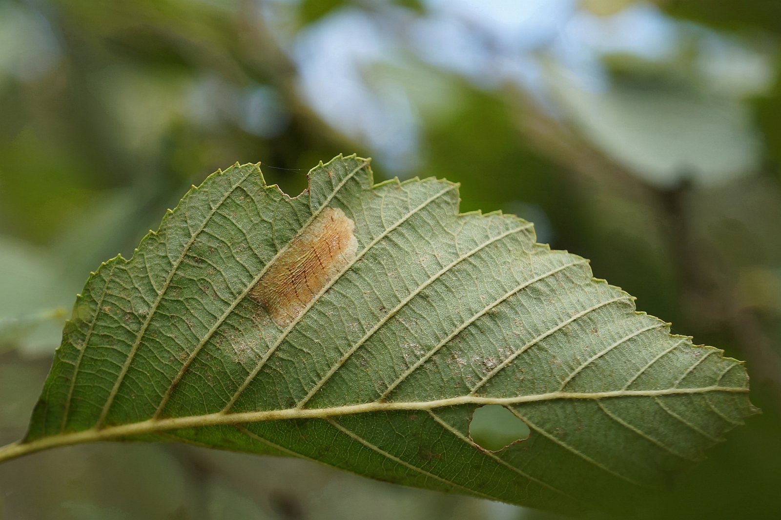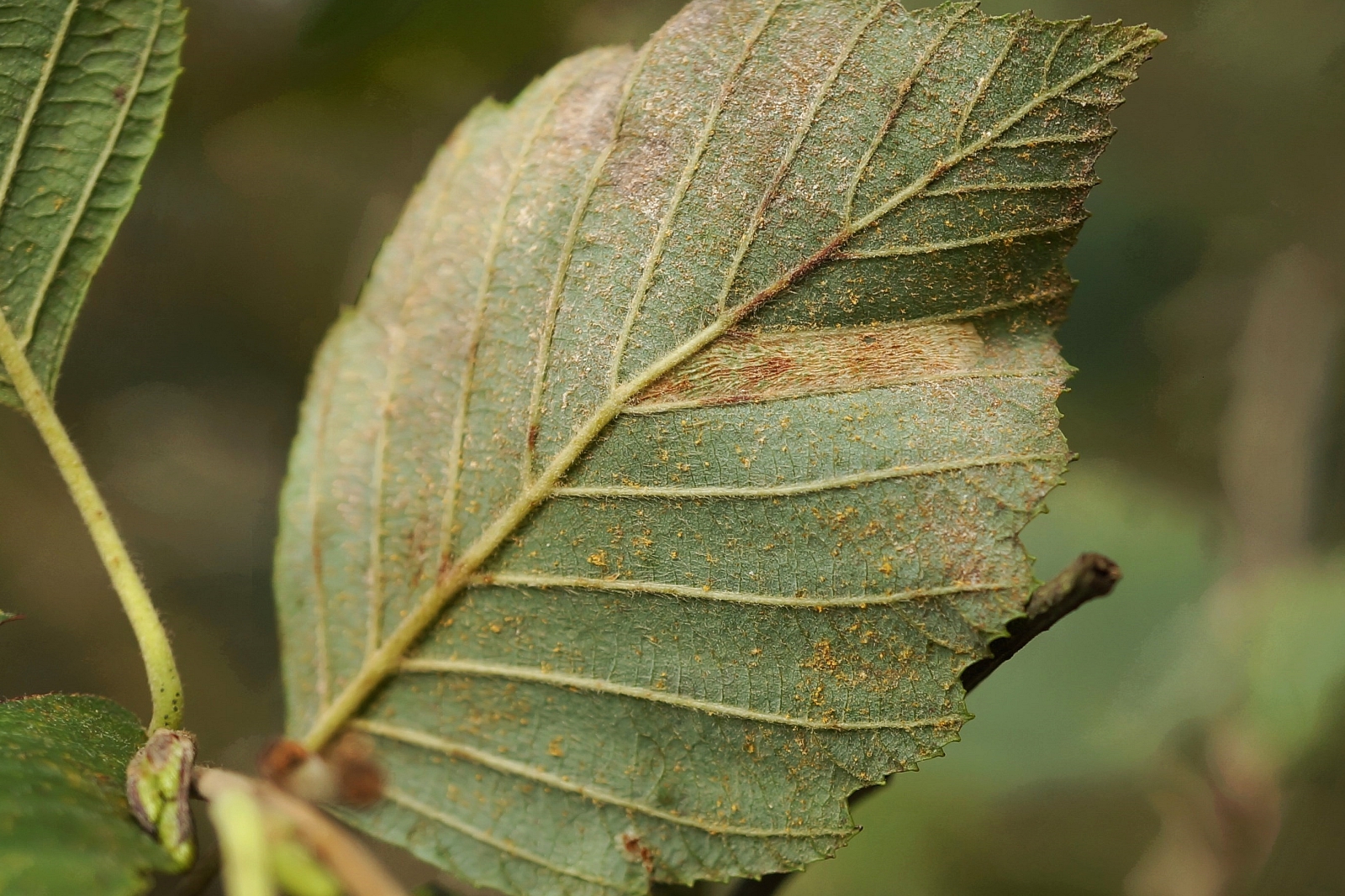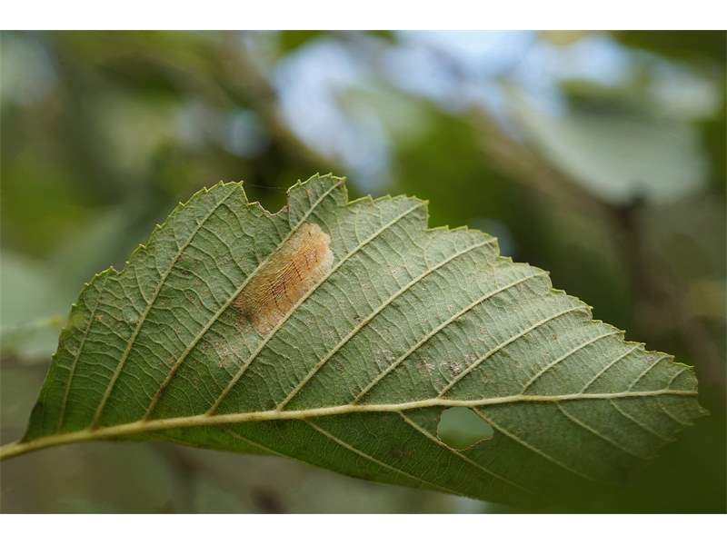 Mine: Faltenmine an der Blattunterseite von Grau-Erle (Alnus incana), meist abseits der Mittelrippe zwischen zwei Seitenrippen.