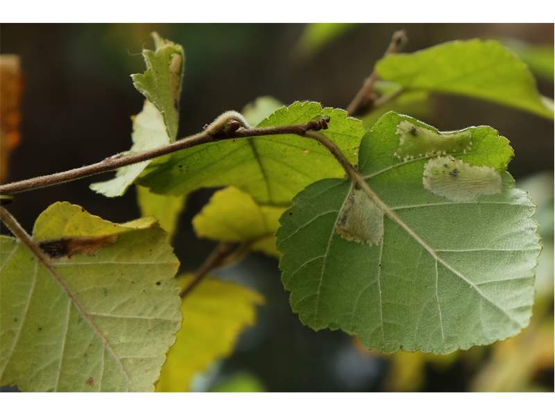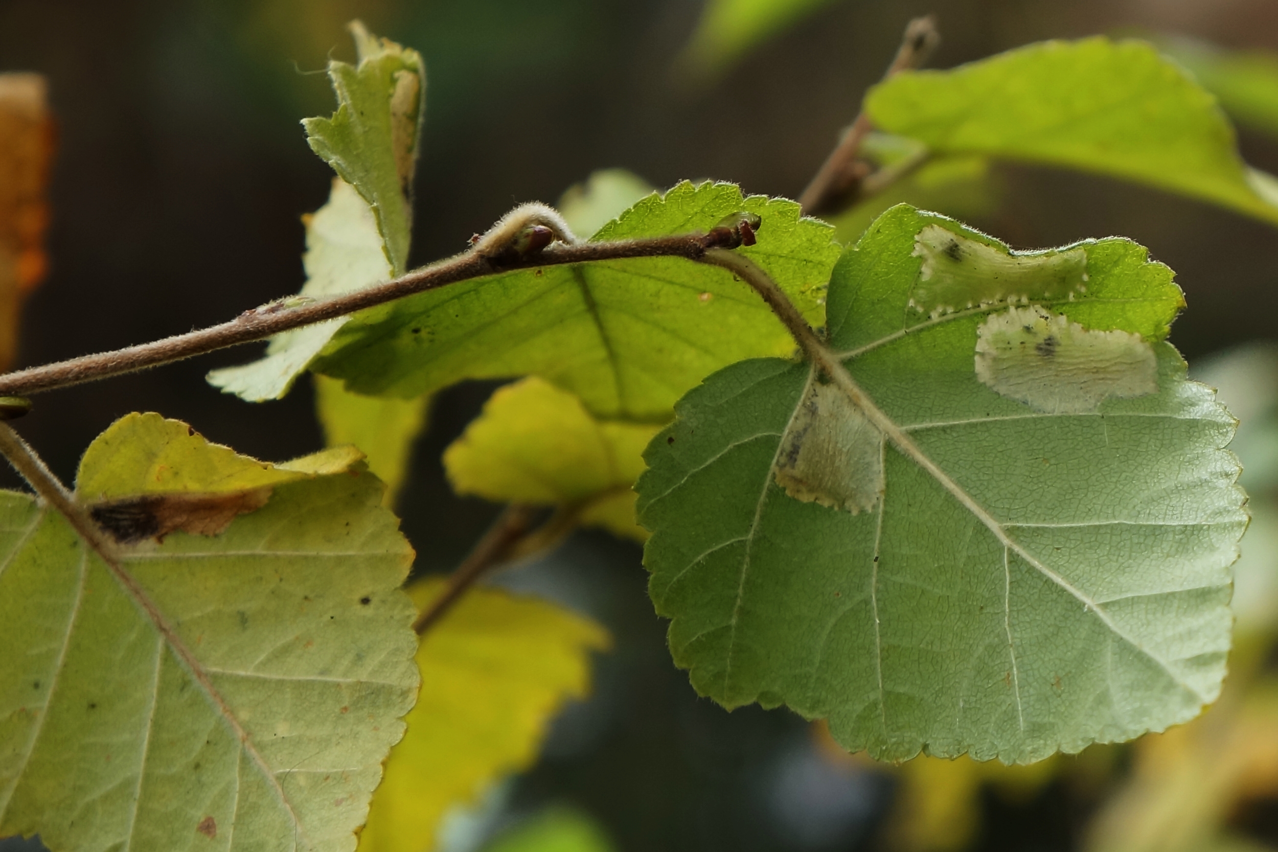 von Phyllonorycter ulmifoliella befallene Birke am 18. Oktober 2015 im Steinbruch Horka bei Kamenz. Mine Unterseitenansicht