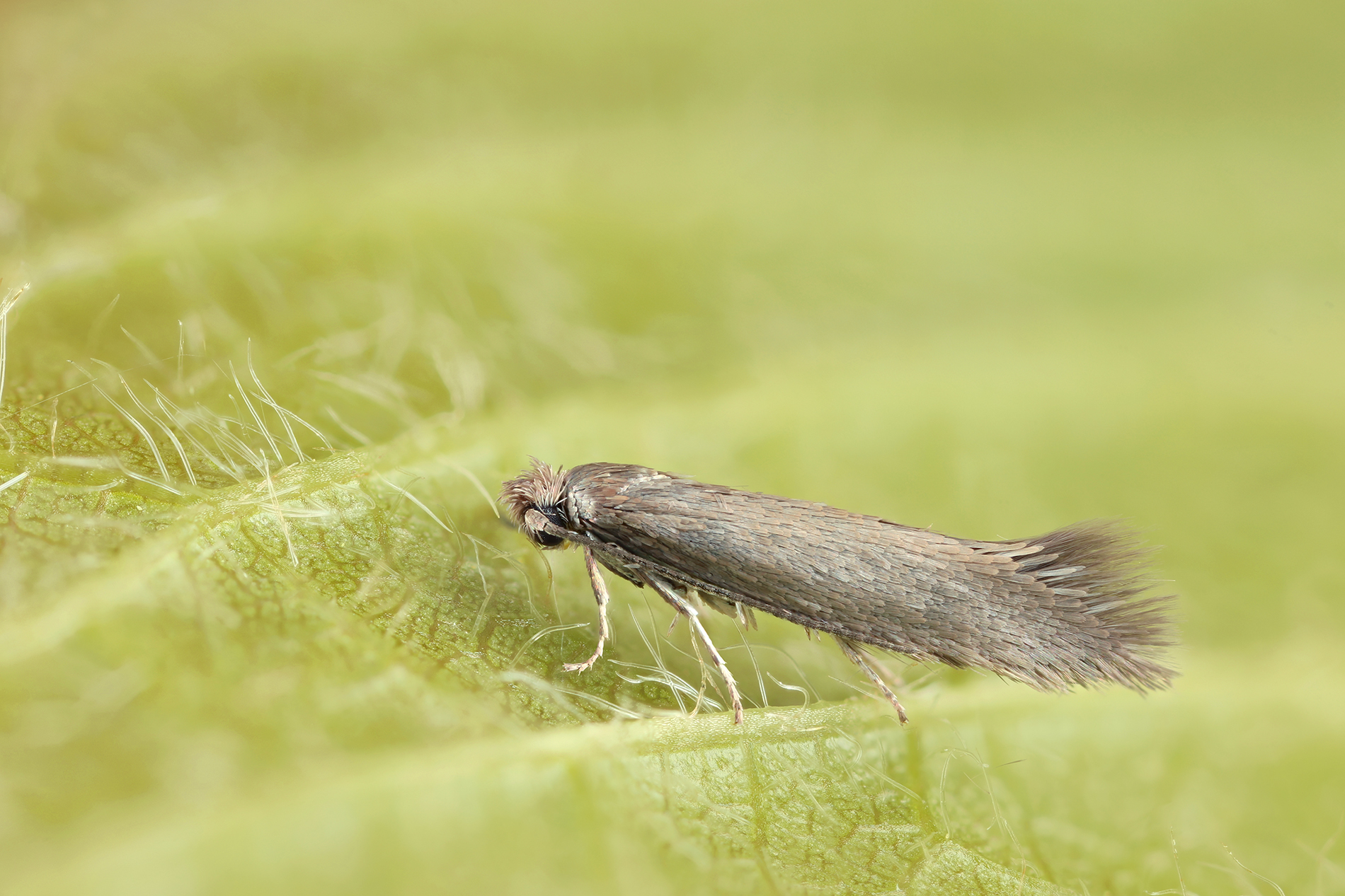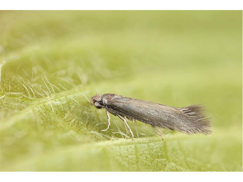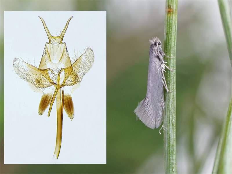 Flügelspannweite 8–10 mm. Kopf weißlich ockergrau, Stirn weiß (manchmal gräulich), Antennen grau, Basalglied weißlich-grau. Vorderflügel der Männchen blassgrau, die der Weibchen weiß und dorsal leicht gräulich. Hinterflügel in beiden Geschlechtern blassgrau, Vorderbeine grau, Mittel- und Hinterbeine weißlich. Abdomen blassgrau. Längenverhältnis Saccus : Phallus im männlichen Genital etwa 1 : 3, bei der sehr ähnlichen