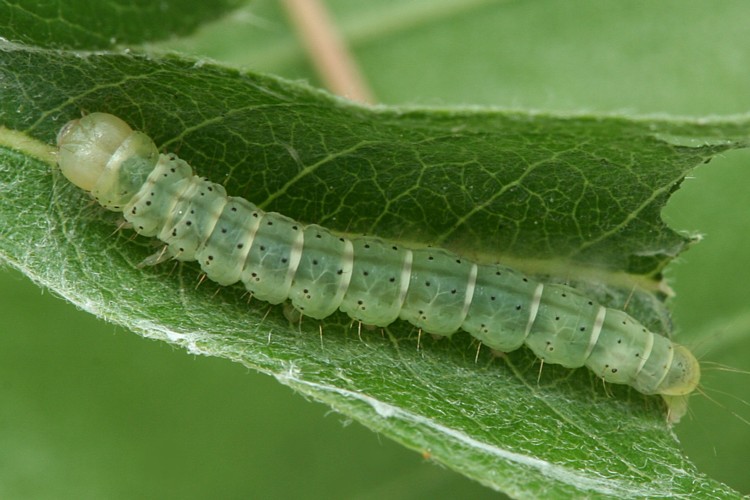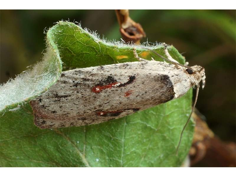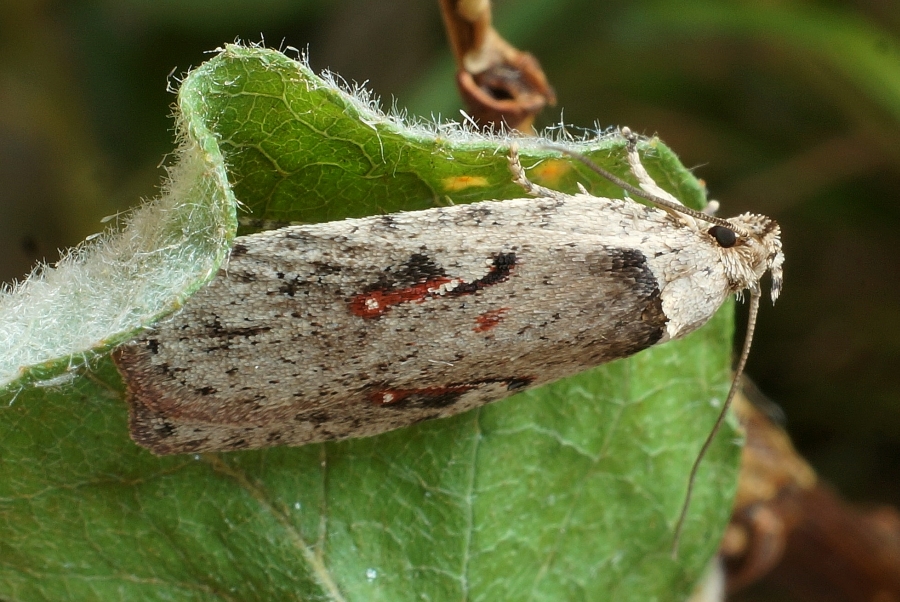 Von Agonopterix ocellana überwintert der Falter. Im Mai kann man noch letzte Falter der Elterngeneration finden, dessen junge Larven jetzt an den verschiedensten Weiden leben. (F. Graf)