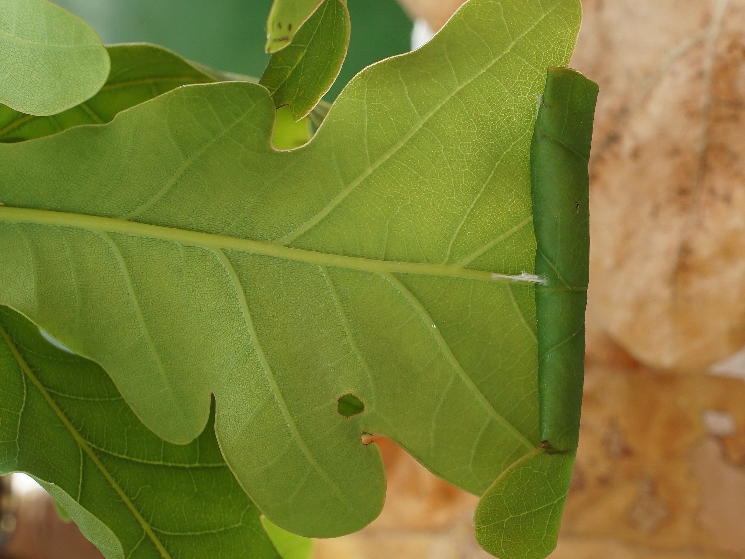 Die Larve lebt im Mai in einer Blattquerrolle an Eiche.