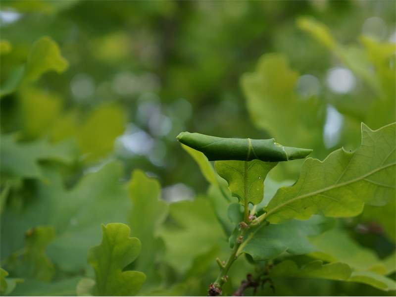 Befallssymptom, quer gerolltes Blatt an Eiche