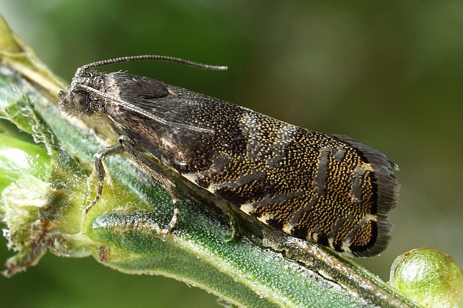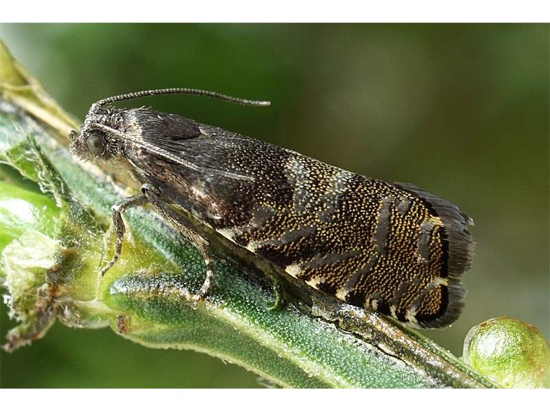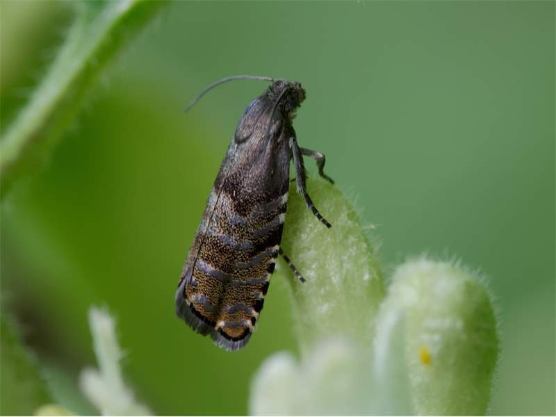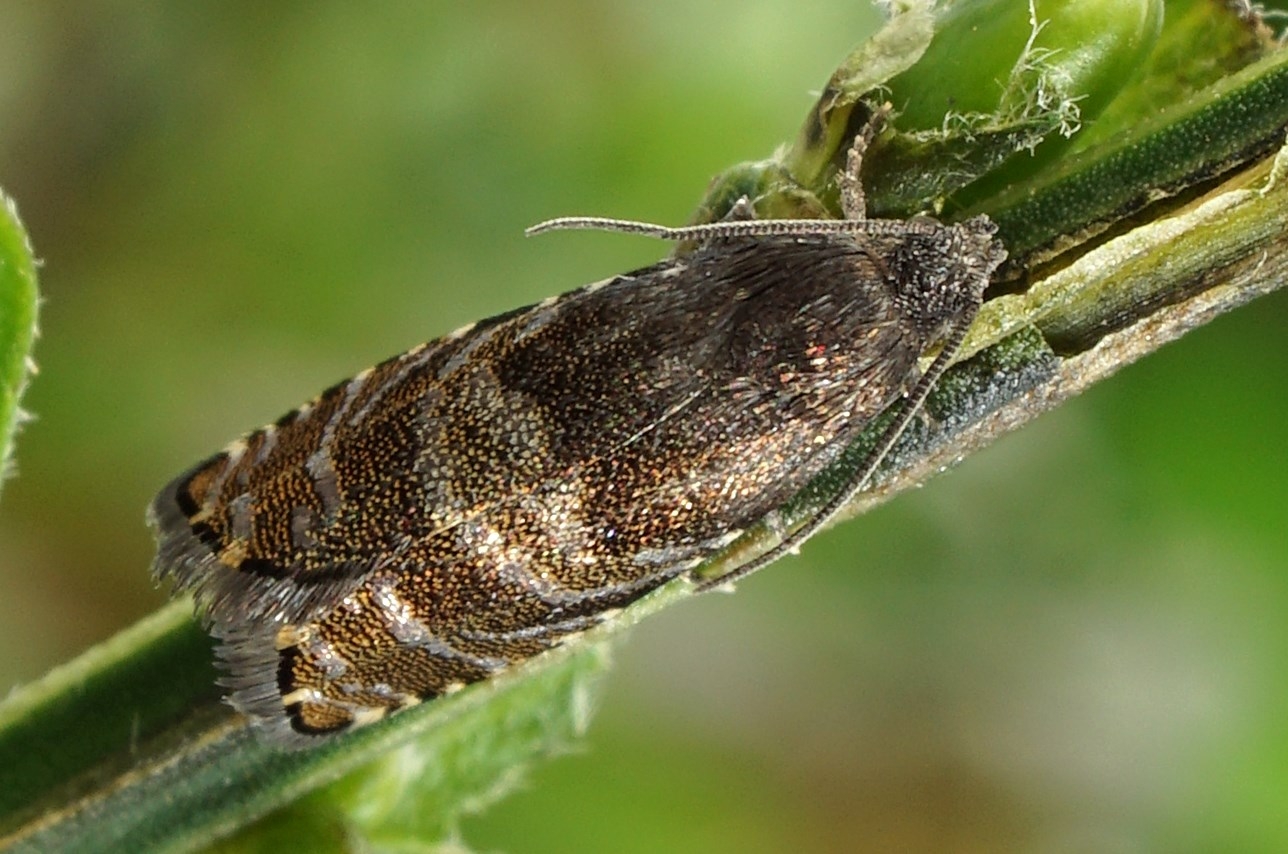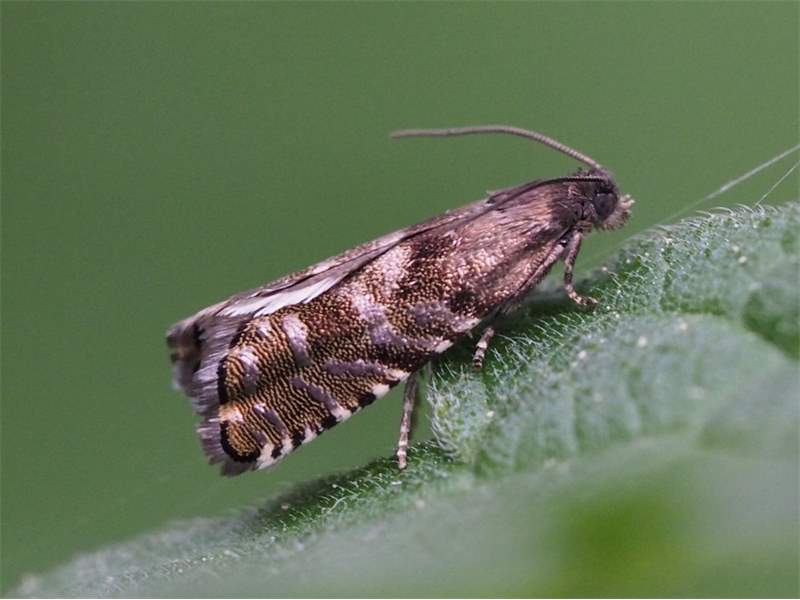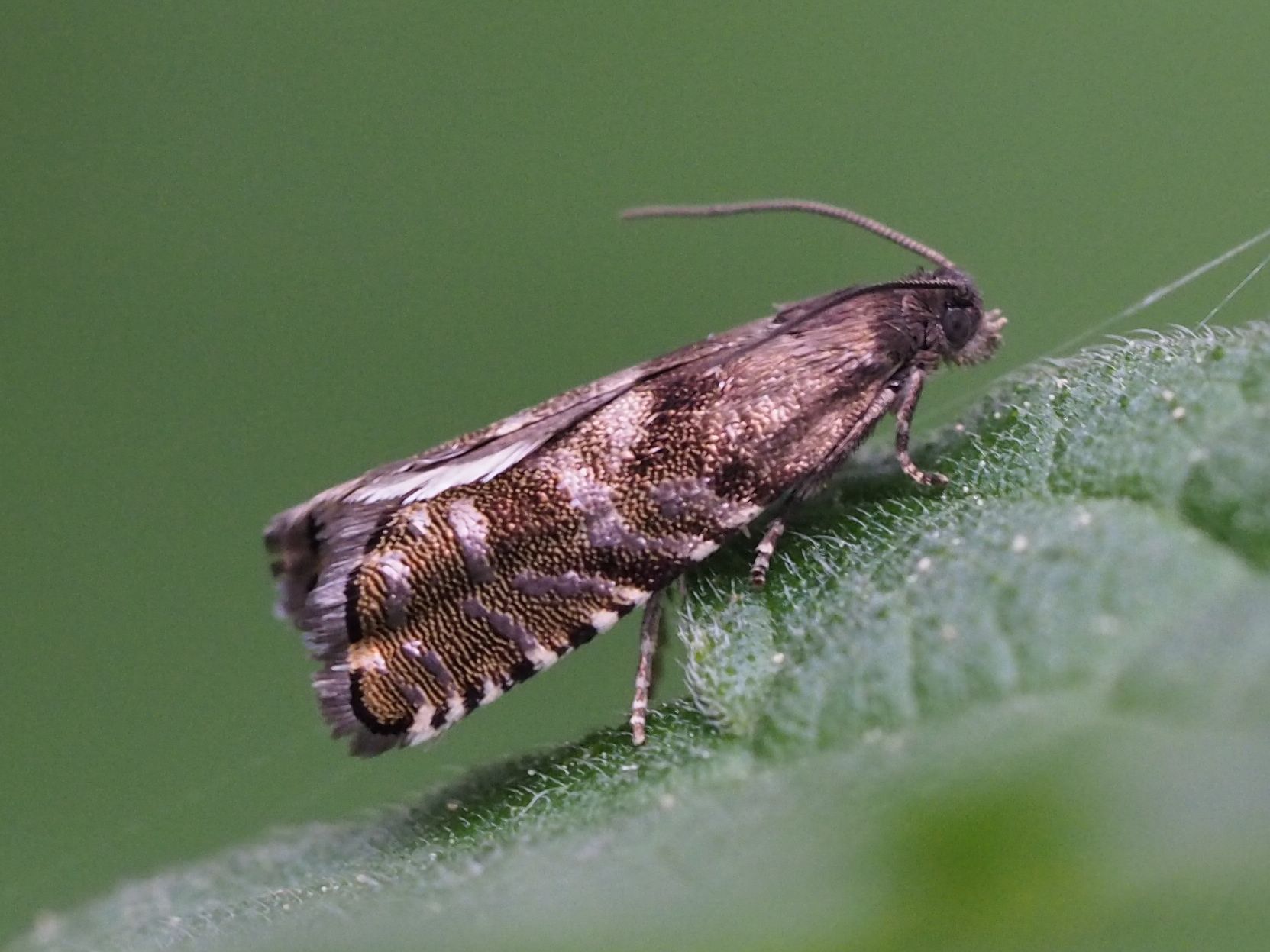 Cydia strobilella auf Brennnessel sitzend. Kämmereiforst bei Eilenburg im Mai 2016