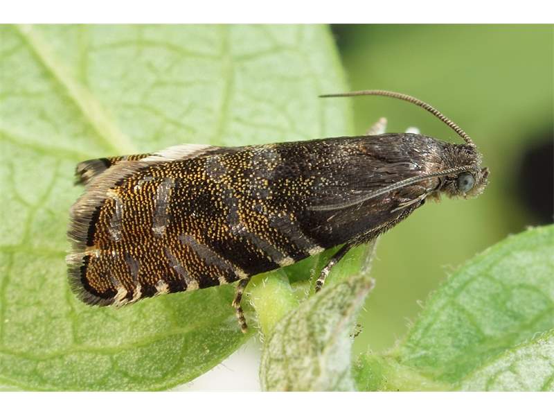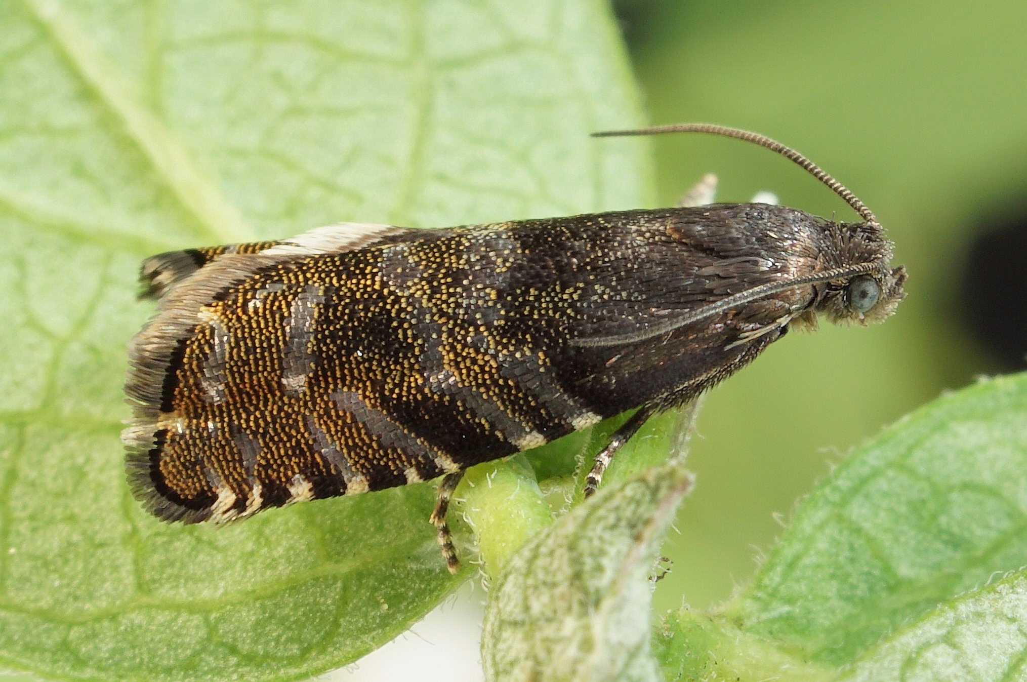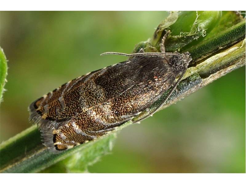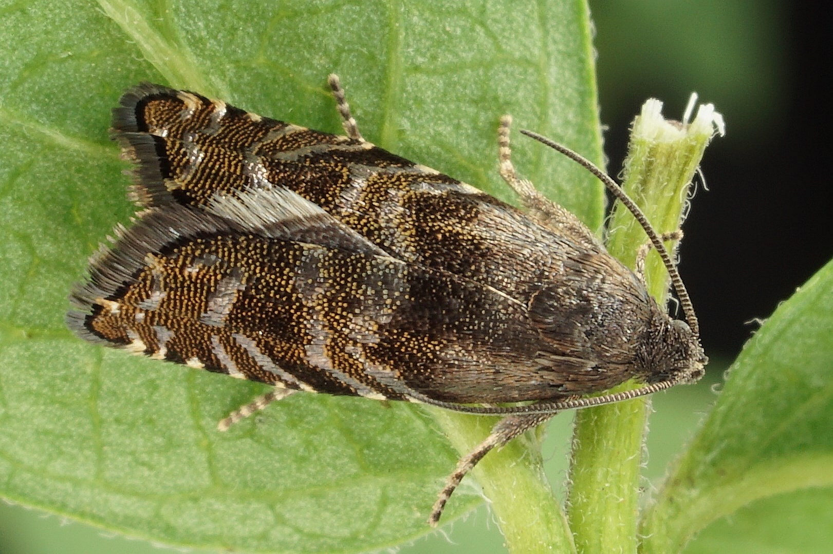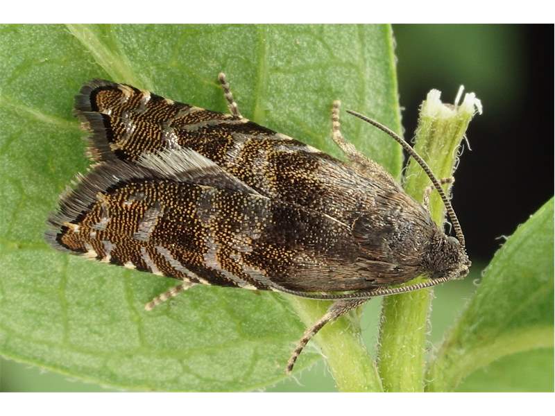 Cydia strobilella, erhalten aus im Winter 2016 im Hohwaldgebiet eingesammelten Fichtenzapfen. Die Falter schlüpften Anfang Mai 2016.