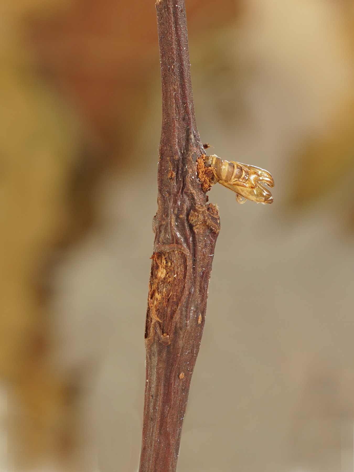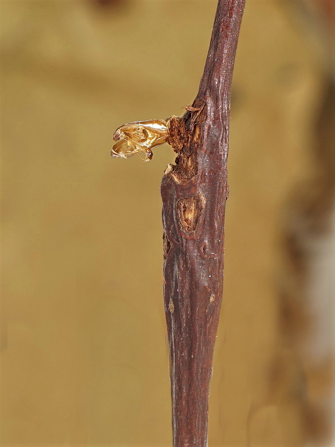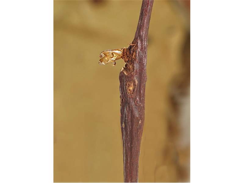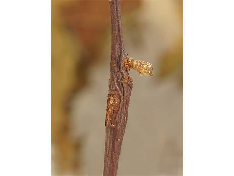 Die Larven entwickeln sich in einjährigen Trieben von breitblättrigen Weidenarten (Salix spp.) wie Ohr-Weide (Salix aurita), Sal-Weide (Salix caprea), Grau-Weide (Salix cinerea) und Reif-Weide (Salix daphnoides). Das Vorhandensein der Larven ist durch eine leichte Zweiganschwellung und ein etwas kümmerliches Wachstum der Zweigspitze erkennbar.