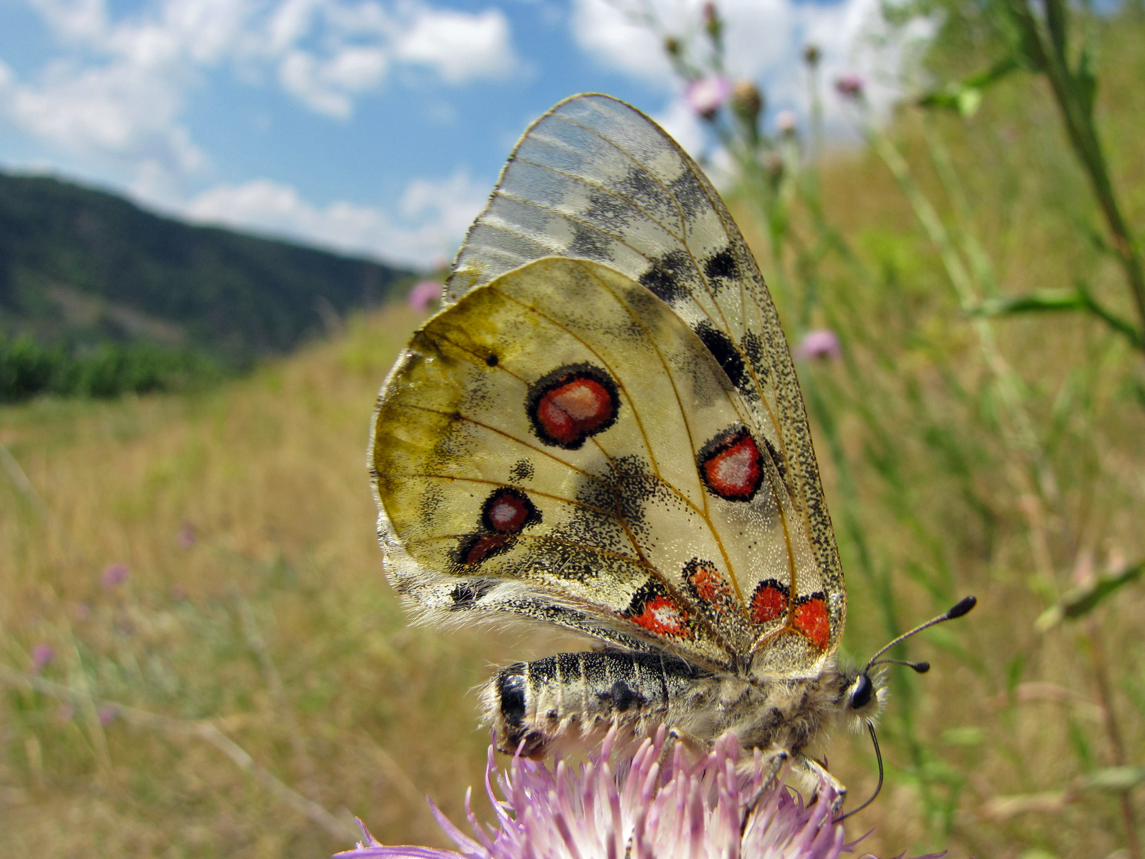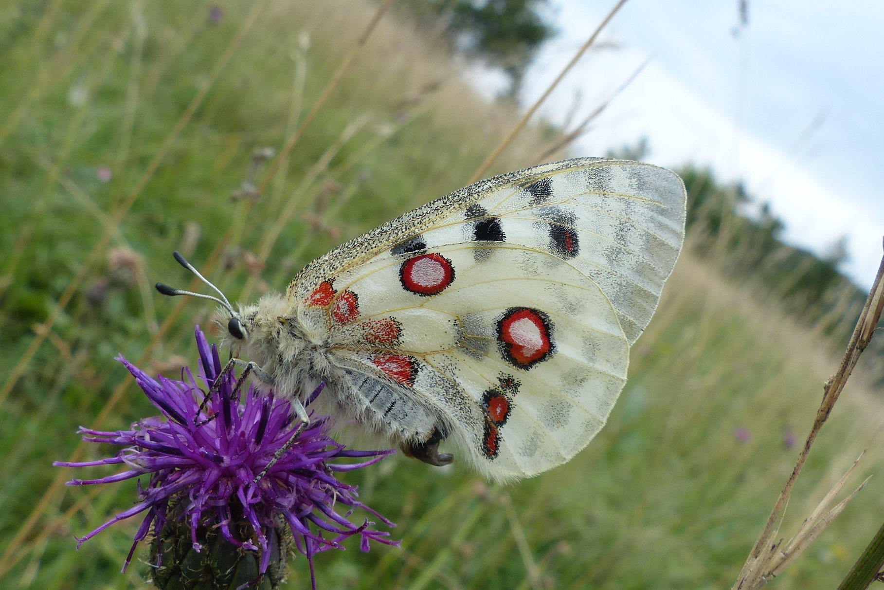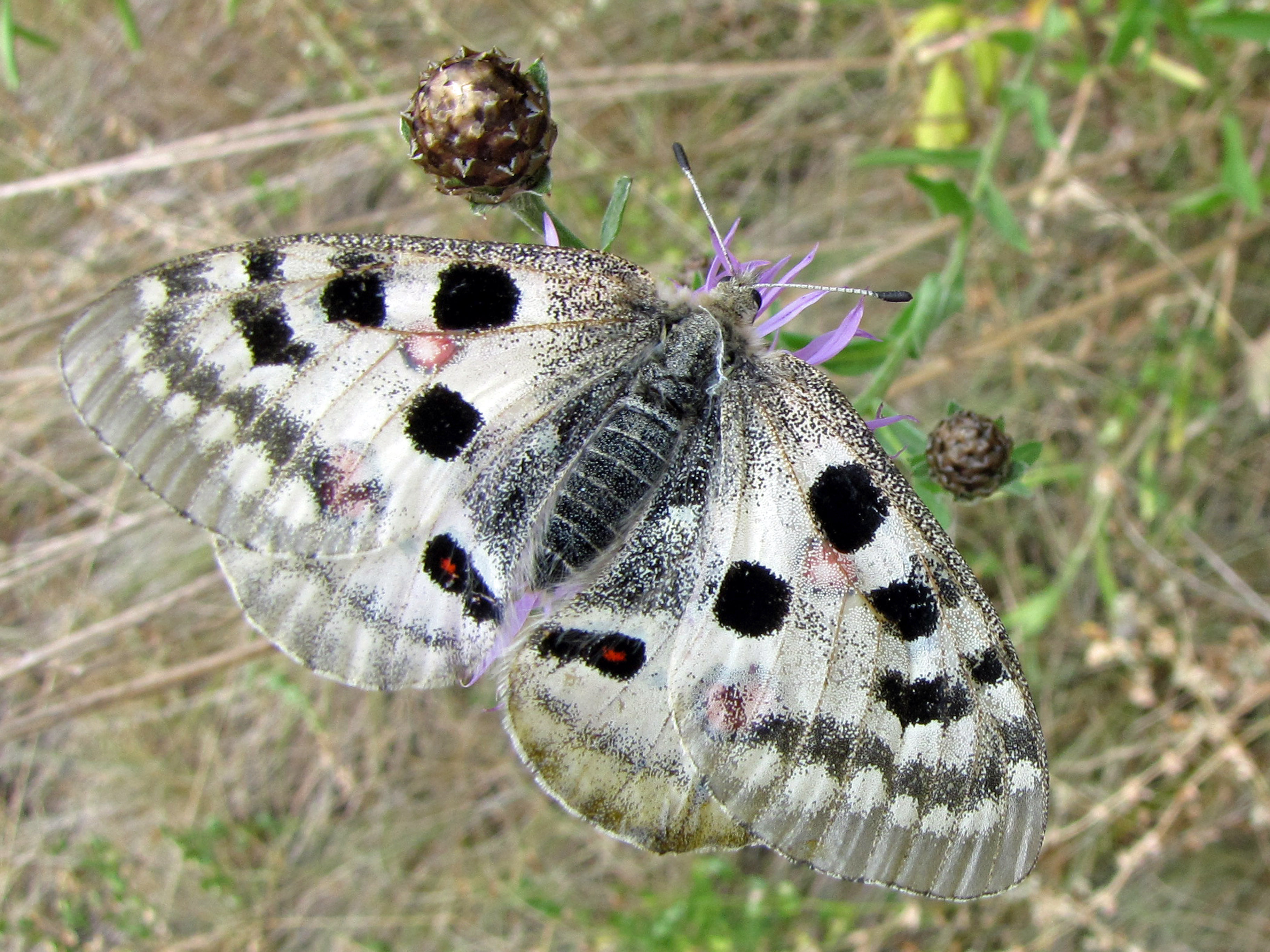 Apollo bei der Nektaraufnahme an einer Flockenblume. Apolloweg bei Cochem/Mosel, 11. Juli 2010