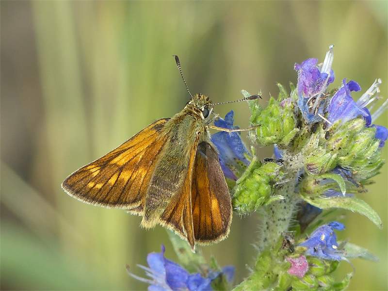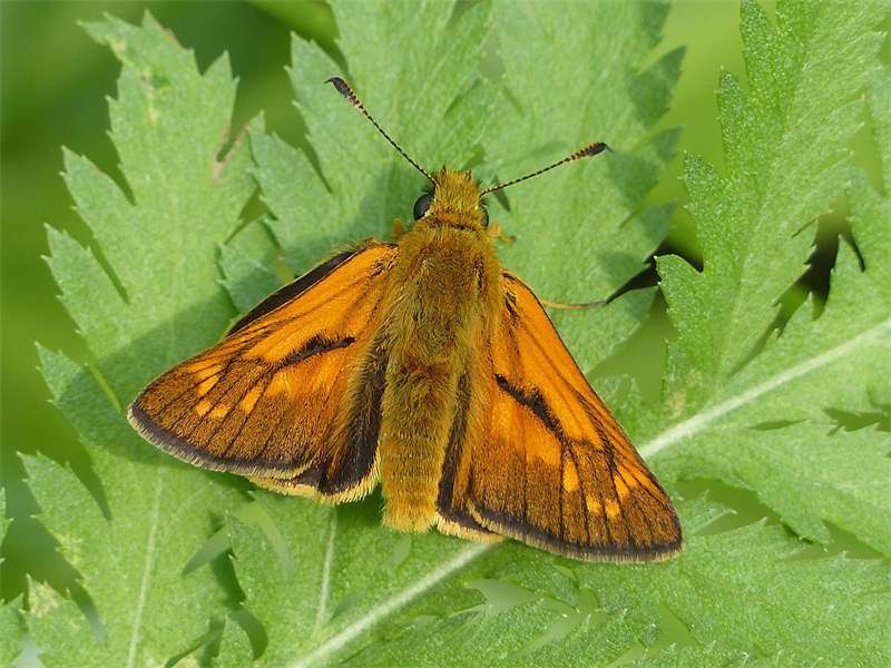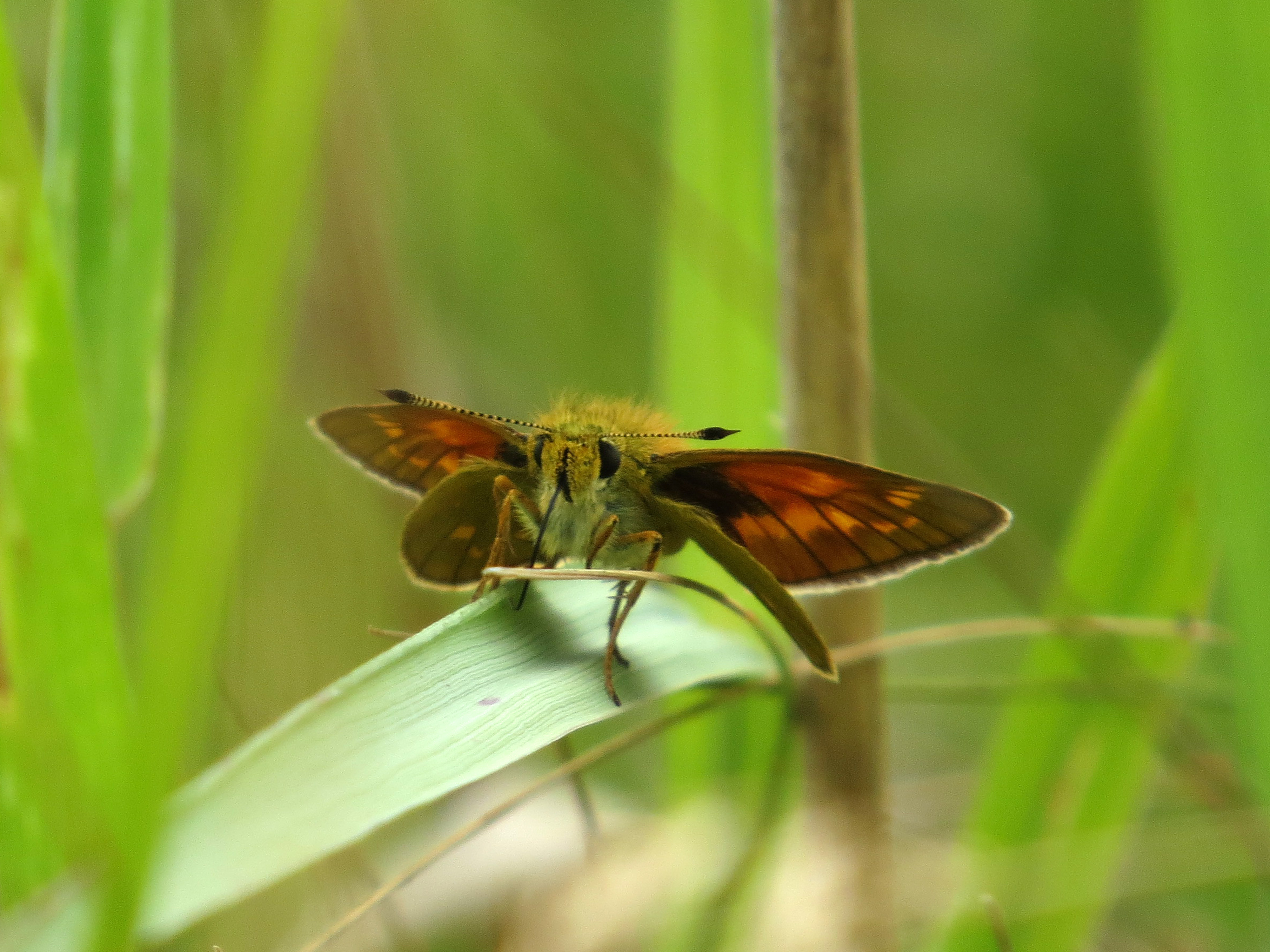 Früher Kommadickkopf im Bereich der Schönauer Lachen am Stadtrand von Leipzig, Juni 2015. Im Portrait sind die spitz ausgezogenen Fühlerenden zu erkennen.