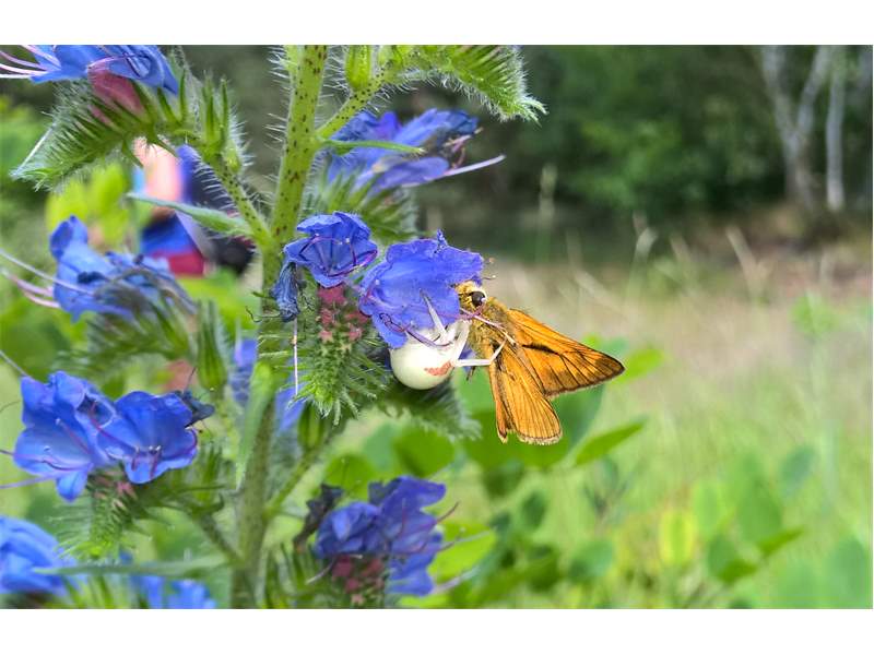 Ein Männchen des Frühen Kommadickkopfes wurde beim Blütenbesuch an Gewöhnlichem Natternkopf ( Echium vulgare) von einer Veränderlichen Krabbenspinne ( Misumena vatia) überrascht. Dresden-Heller, Juni 2015. [Nokia Lumia 930] (© Matthias Nuß)( Bild vergrößern)