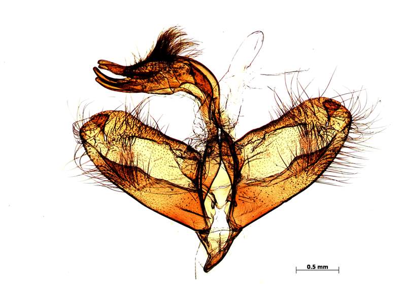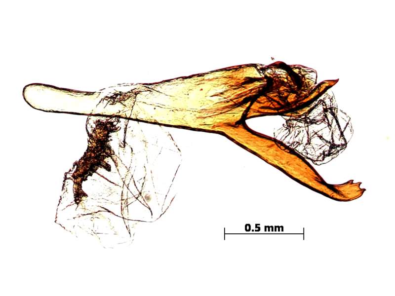 Männliches Genital: Uncus kurz zweizipfelig, Gnathos lang zweizipfelig; Valven dorso-distal mit einem dreieckigen Zahn, der nicht über die Costa hinausragt. Phallus posterior mit zwei großen asymmetrischen Skleriten.