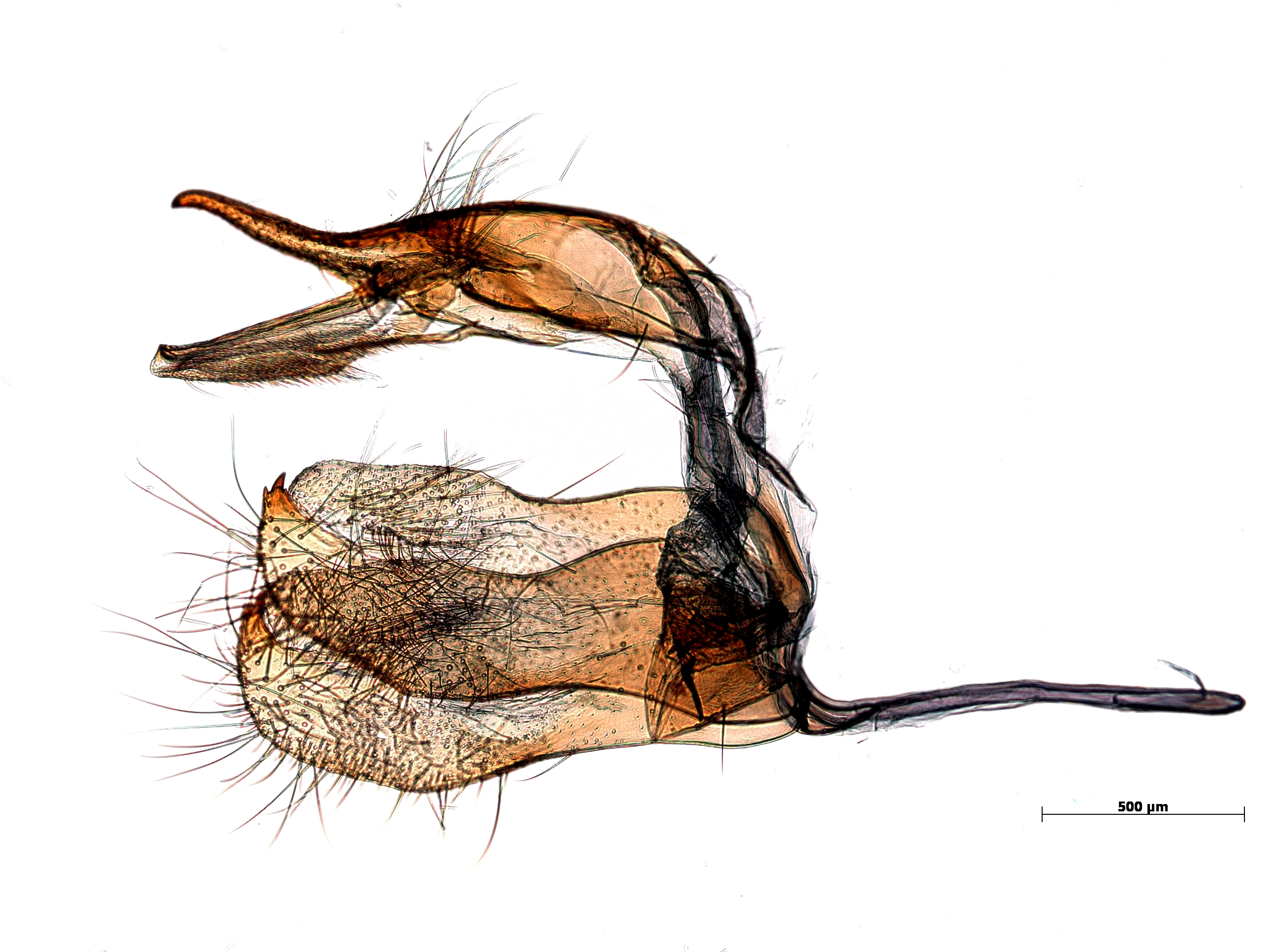 Im männlichen Genital sind die Valven dorso-posterior leicht gekerbt, posterior zwei (bis drei) längere, nach dorsal gerichtete Dornen.