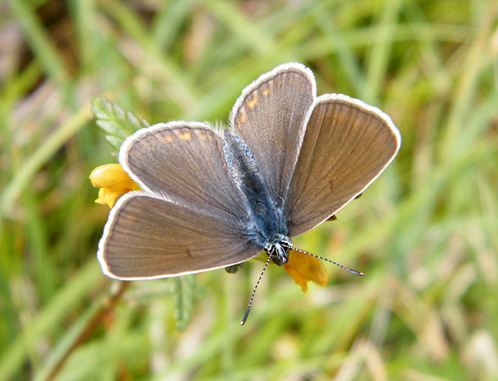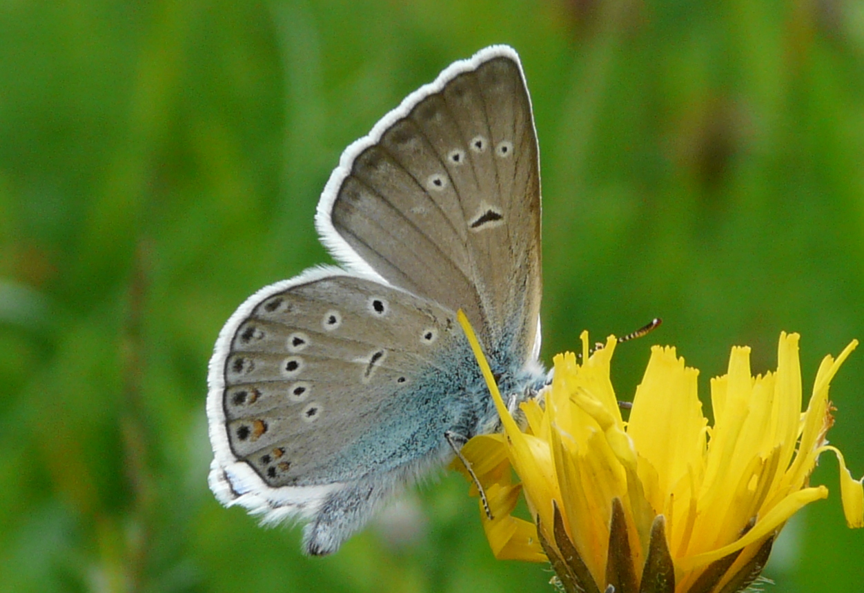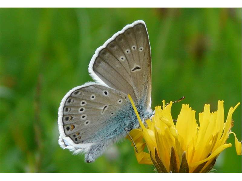 Flügelunterseiten hellgrau (Männchen) bis hellbraun (Weibchen), mit glänzend hellblauer Basis, ohne weißen Fleck oder Strich zwischen den schwarzen, weiß umrandeten Punkten; orange Punktreihe entlang der Flügelränder (bei den Männchen undeutlicher ausgeprägt).