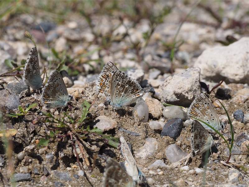 Männliche Silberbläulinge beim Aufsaugen von Mineralien auf dem Boden.
