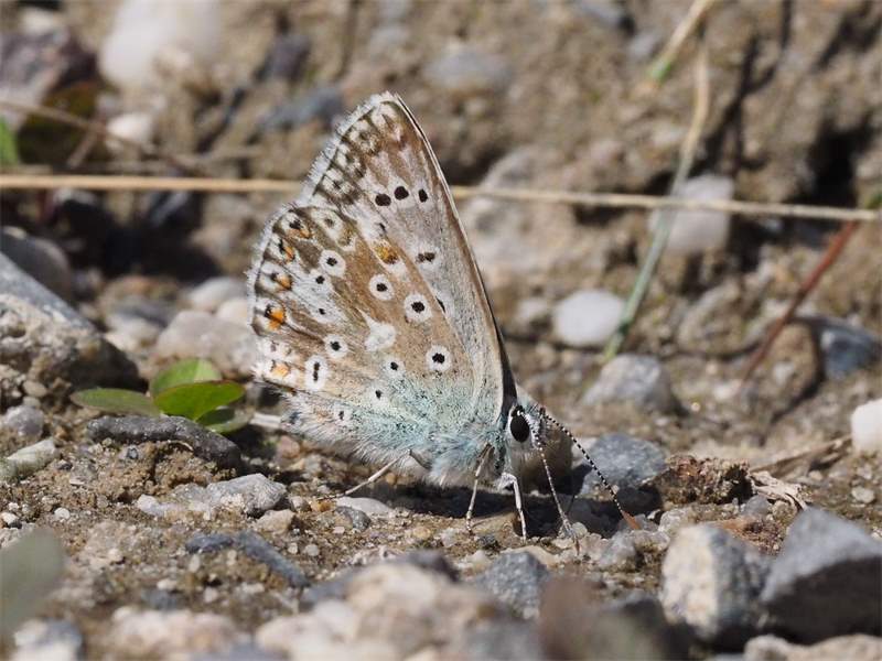 Männlicher Silberbläuling beim Aufsaugen von Mineralien auf dem Boden.