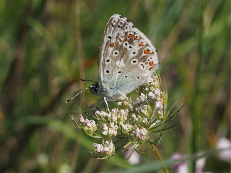 Silberbläuling bei mittäglicher Verschnaufpause auf einer noch unvollständig geöffneten Doldenblüte. Juli 2017 bei Neustadt (Spree)