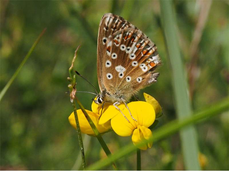 Langanhaltend saugen die Falter (im Bild ein Weibchen) an gelb blühenden Schmetterlingsblütengewächsen, insbesondere an dem reichlich vorhandenen Hornklee. Juli 2017 bei Neustadt (Spree) (© Matthias Nuß)( Bild vergrößern)