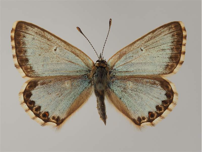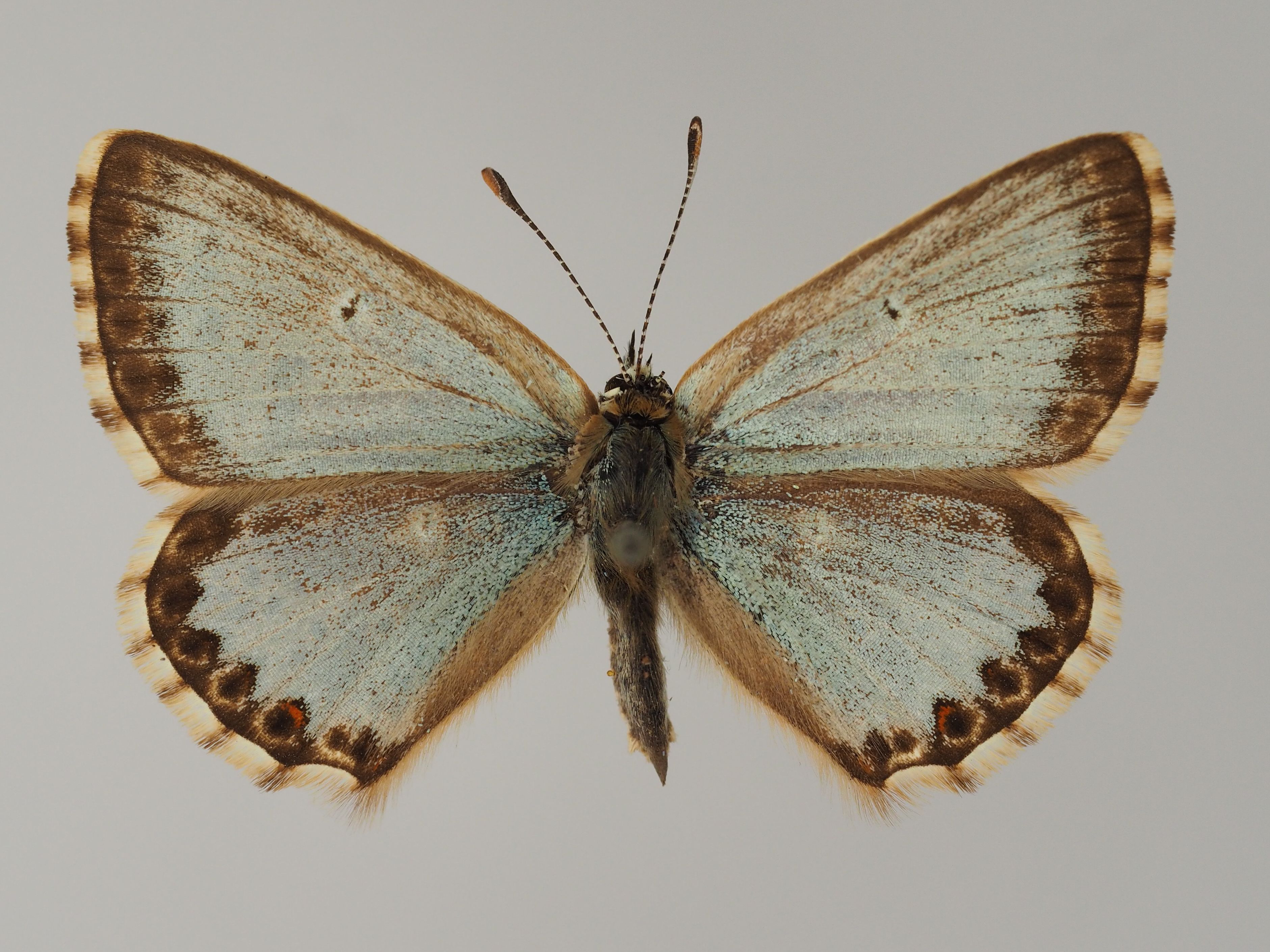 Blaues Weibchen des Silberbläulings vom 1. August 1933 aus Ketsch am Rhein, coll. W. Heinitz. Senckenberg Museum für Tierkunde Dresden