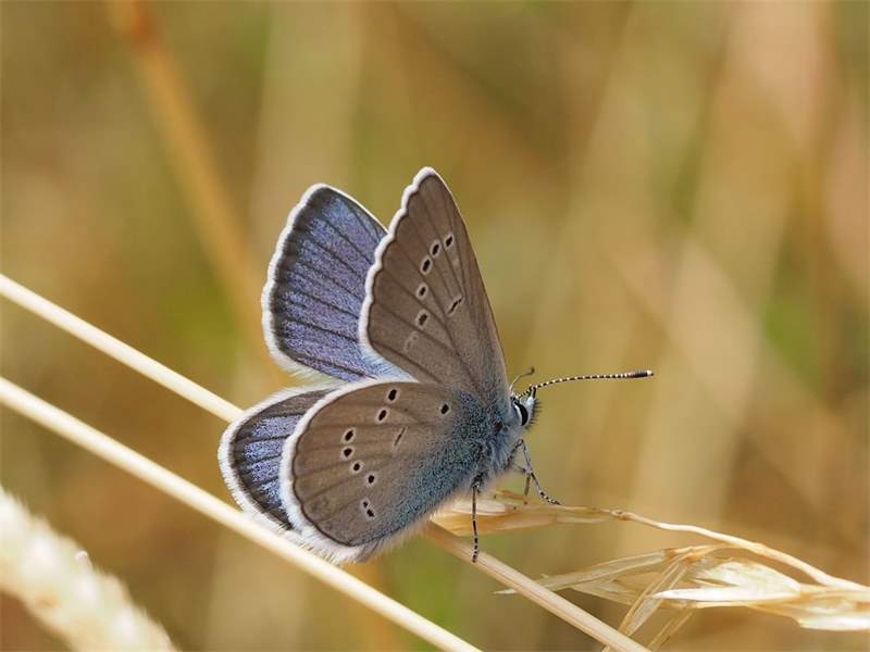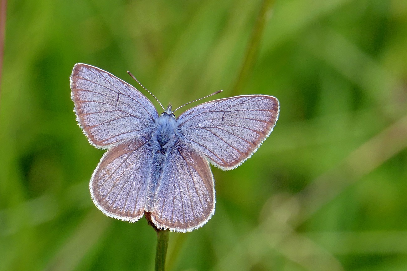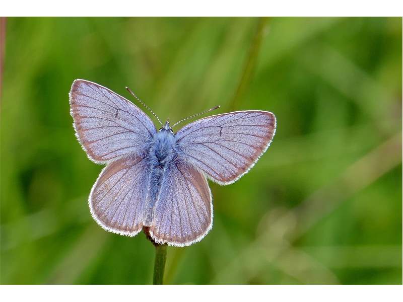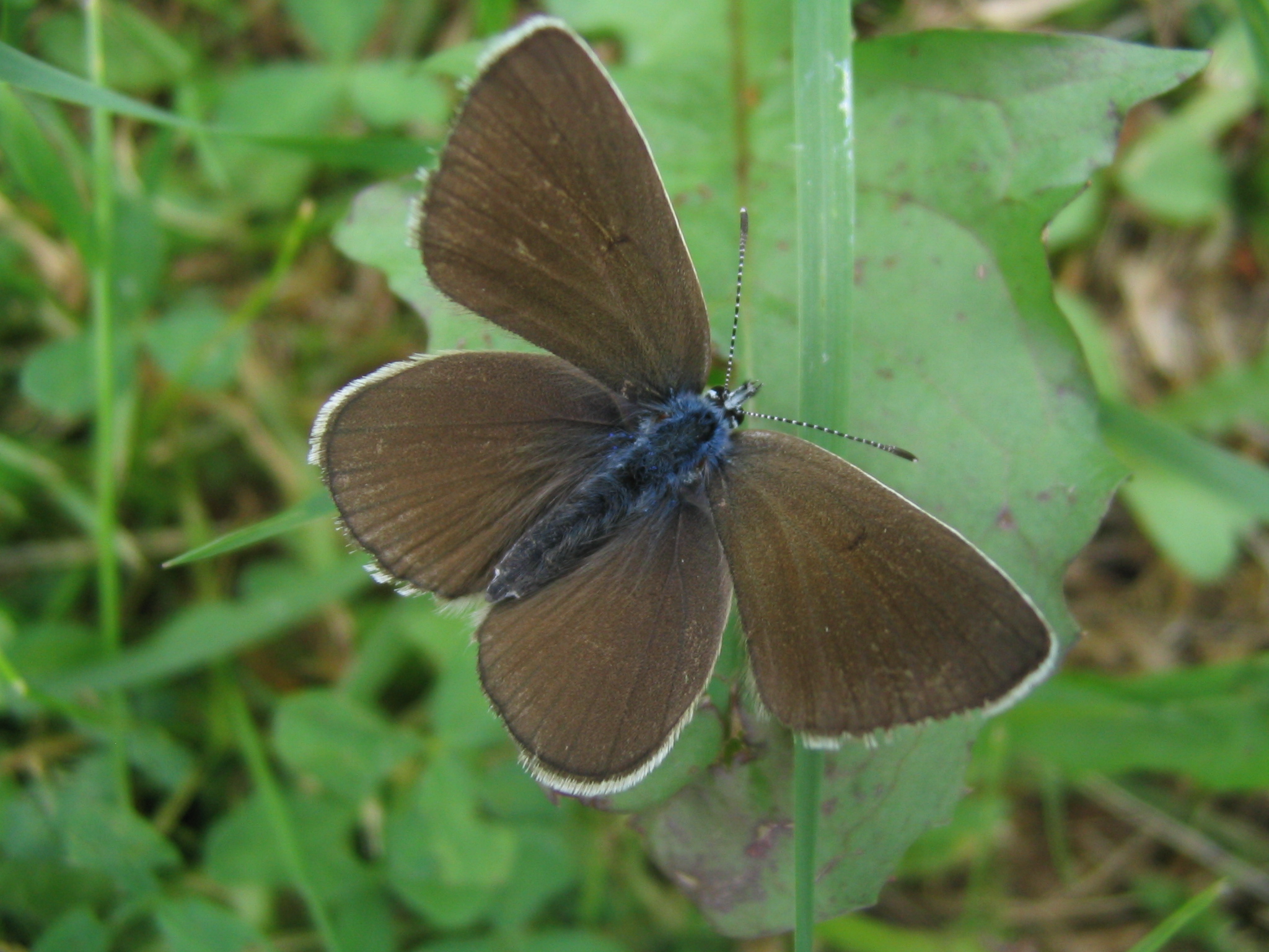 Flügeloberseiten der Männchen dunkelblau, Adern und Flügelränder deutlich schwarzbraun; die Weibchen oberseits braun; beide Geschlechter mit weißen Fransen an den Flügelrändern.