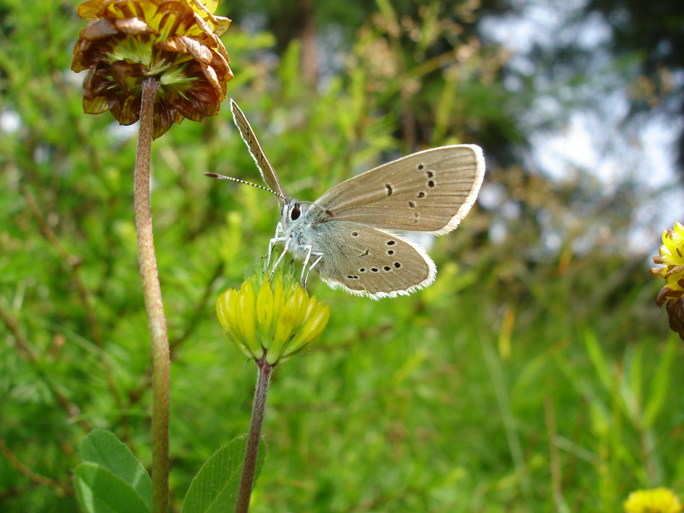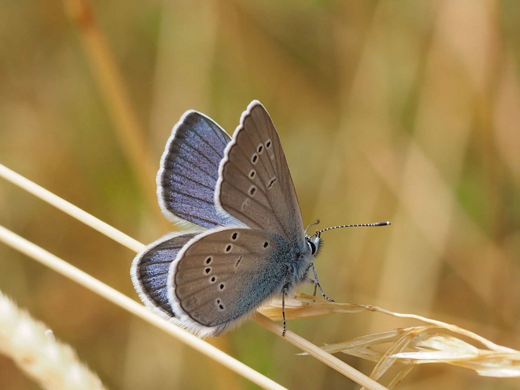 Flügelunterseiten hell grau bis braun, an der Basis blau bestäubt, die schwarzen Punkte weiß gerandet (keine orangen Flecken und keine zweite, schattenartige Punktreihe vor den Flügelrändern).