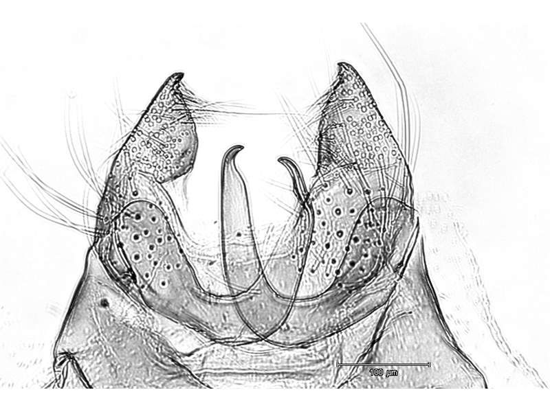 Im männlichen Genital sind die Uncusseiten dreiecksförmig und das dorso-distale Valvenende ist breit gerundet und fein gezähnt.