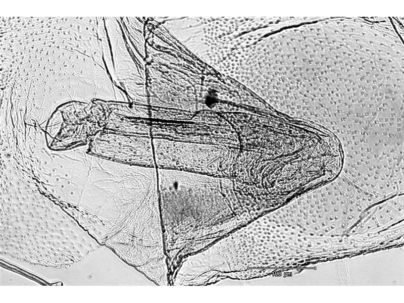 Männliches Genital von Plebejus idas. Distales Valvenende. Dahlen, Juli 1911, Seiler leg., Nuss prep. 971, Senckenberg Museum für Tierkunde Dresden (© Matthias Nuß)( Bild vergrößern)