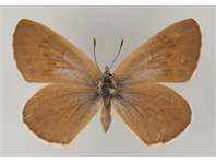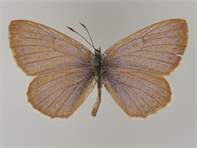 Flügeloberseiten der Männchen blau mit braunschwarzem Rand, die der Weibchen einfarbig braun; beide Geschlechter mit weißen, schwach schwarz gescheckten Fransen.