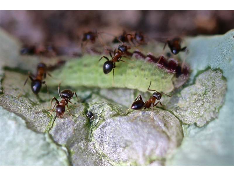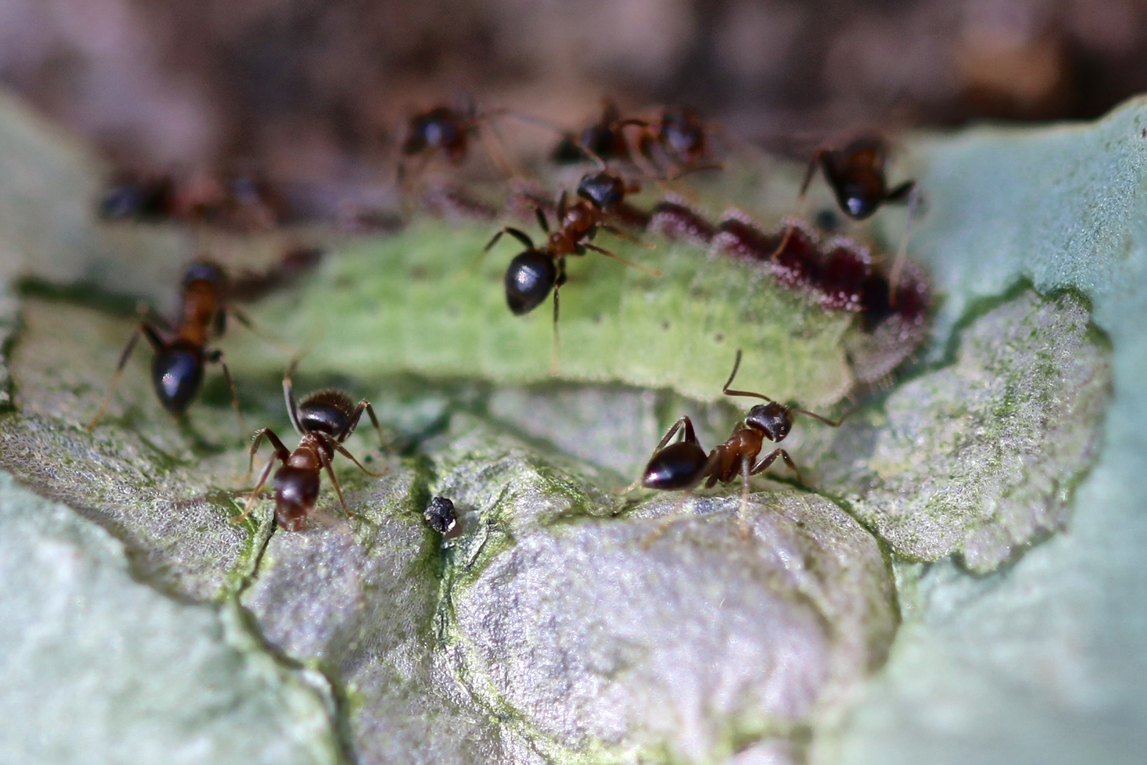 Larve des Fetthennen-Bläulings an Fetthenne mit Ameisenbesuch. Dresden, Zschonergrund, Alter Steinbruch, Juni 2018 (© Katrin Ritter)( Bild vergrößern)