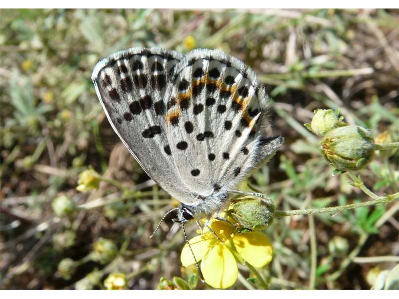 Flügelunterseiten weißlich mit fetten schwarzen Punkten, auf den Hinterflügeln zwischen den Flecken ein orangefarbenes Band.
