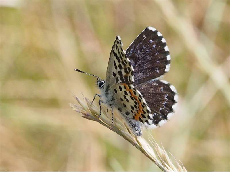 Fetthennenbläulinge am späten Nachmittag im Mai 2016 in Meißen-Cölln. Bei Sonnenschein öffnen die Falter ihre Flügel gen Sonne; ziehen Wolken auf und verdecken die Sonne, suchen sie an verdorrten Pflanzen aus dem Vorjahr, die dem Wind besser widerstehen, kopfüber und mit zusammengeklappten Flügeln einen Ruheplatz (© Matthias Nuß)( Bild vergrößern)