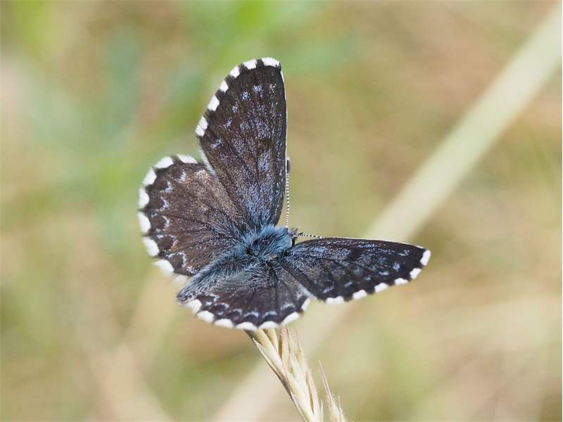 Flügeloberseiten dunkelbraun bis schwarzbraun mit mehr (Männchen) oder weniger (Weibchen) blauer Beschuppung. Fransen deutlich schwarz weiß gescheckt.