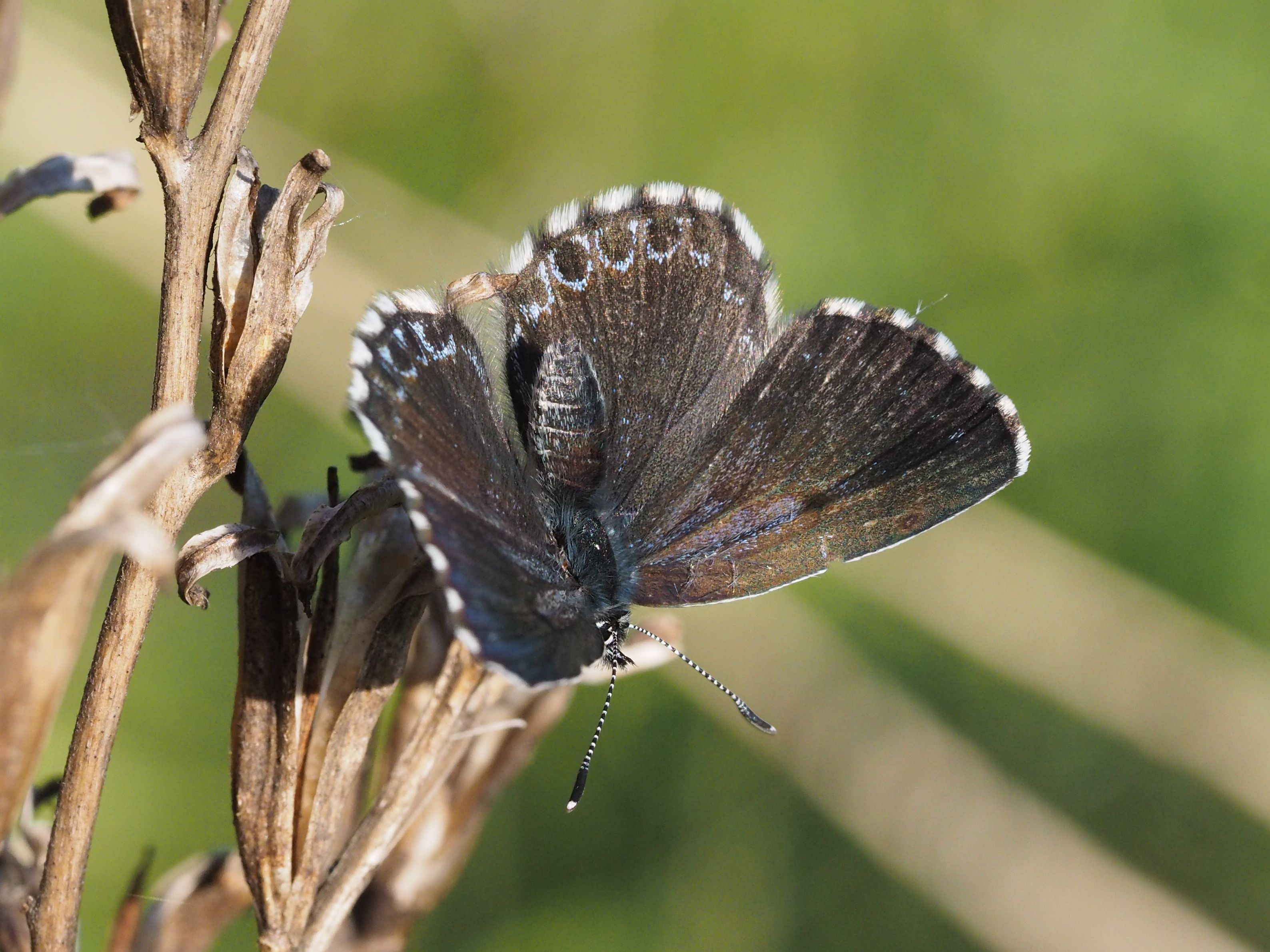 Fetthennenbläulinge am späten Nachmittag im Mai 2016 in Meißen-Cölln. Bei Sonnenschein öffnen die Falter ihre Flügel gen Sonne; ziehen Wolken auf und verdecken die Sonne, suchen sie an verdorrten Pflanzen aus dem Vorjahr, die dem Wind besser widerstehen, kopfüber und mit zusammengeklappten Flügeln einen Ruheplatz