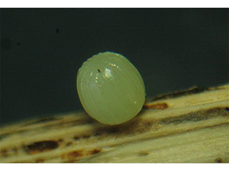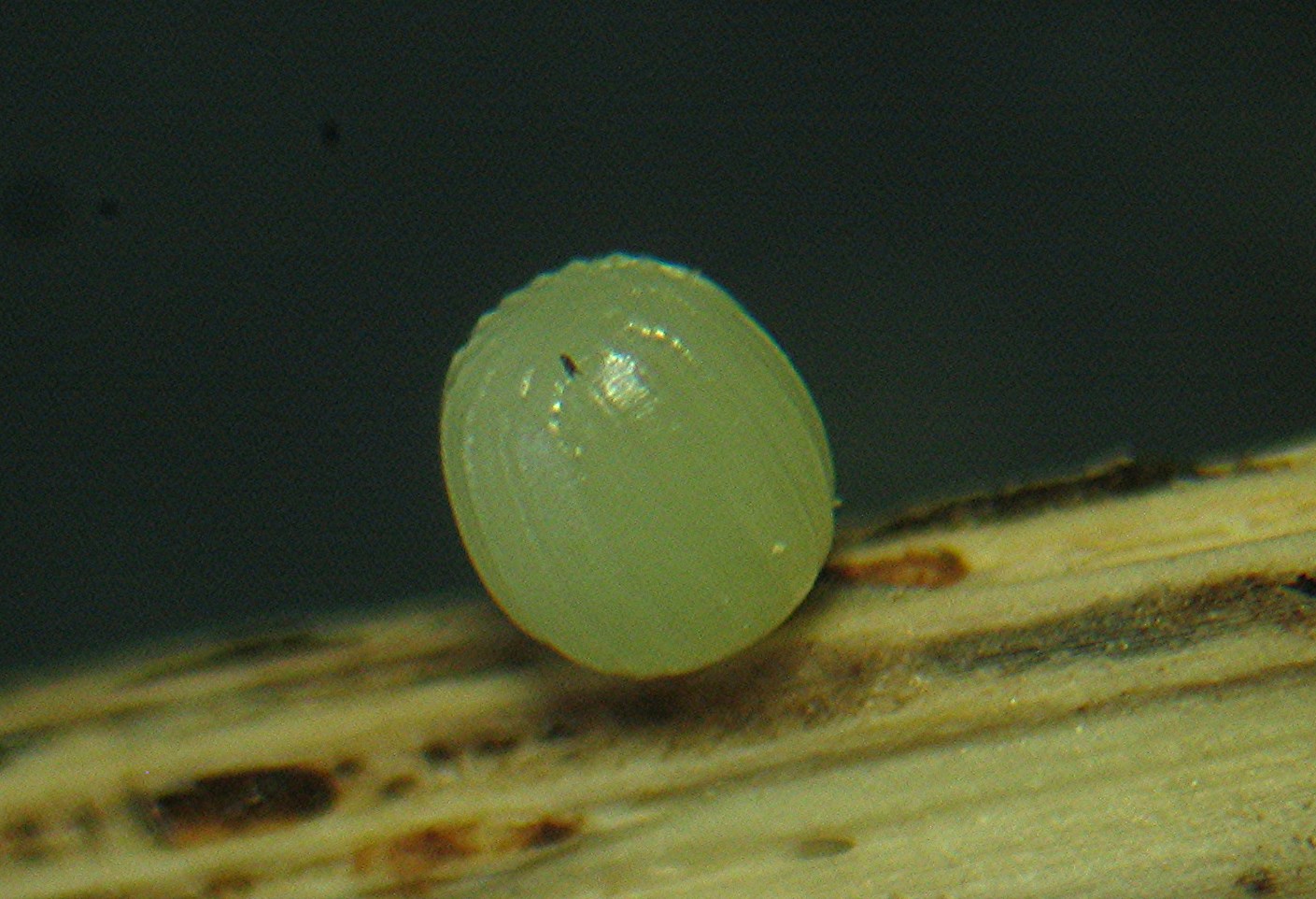 Ei von E. medusa, am 1. Juni 2014 bei Tiefenbrunn (Vogtland) abgelegt. Die Falter legen ihre Eier an dürre Grashalme.
