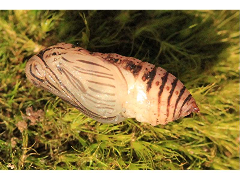 Erebia medusa-Puppe aus dem Ei vom 1. Juni 2014. Studioaufnahme der Puppe am 16.3.2015.