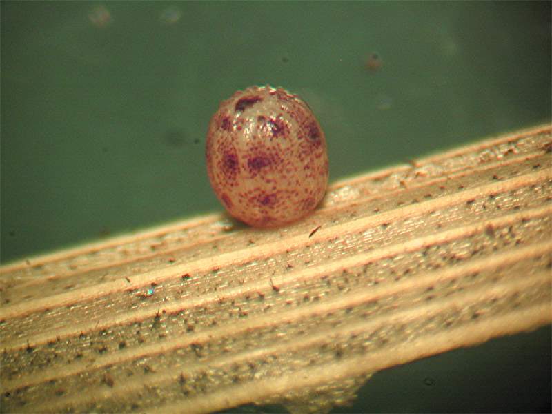 Ei von E. medusa, am 1. Juni 2014 bei Tiefenbrunn (Vogtland) abgelegt. Am nächsten Tag bildeten sich die im Bild sichtbaren Flecken aus. Das Ei ist jetzt wunderbar farblich an das dürre Gras angepasst.