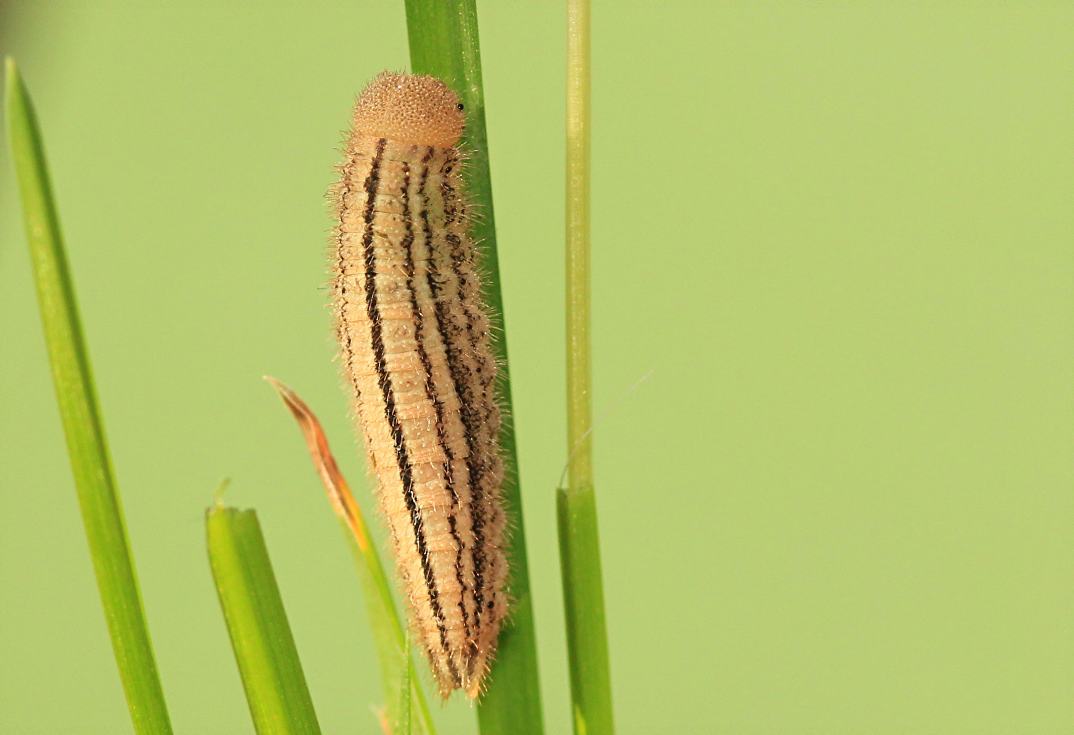 Erebia medusa-Raupe aus dem Ei vom 1. Juni 2014. Studioaufnahme vom 7.2.2015