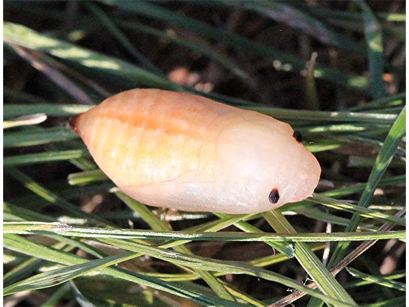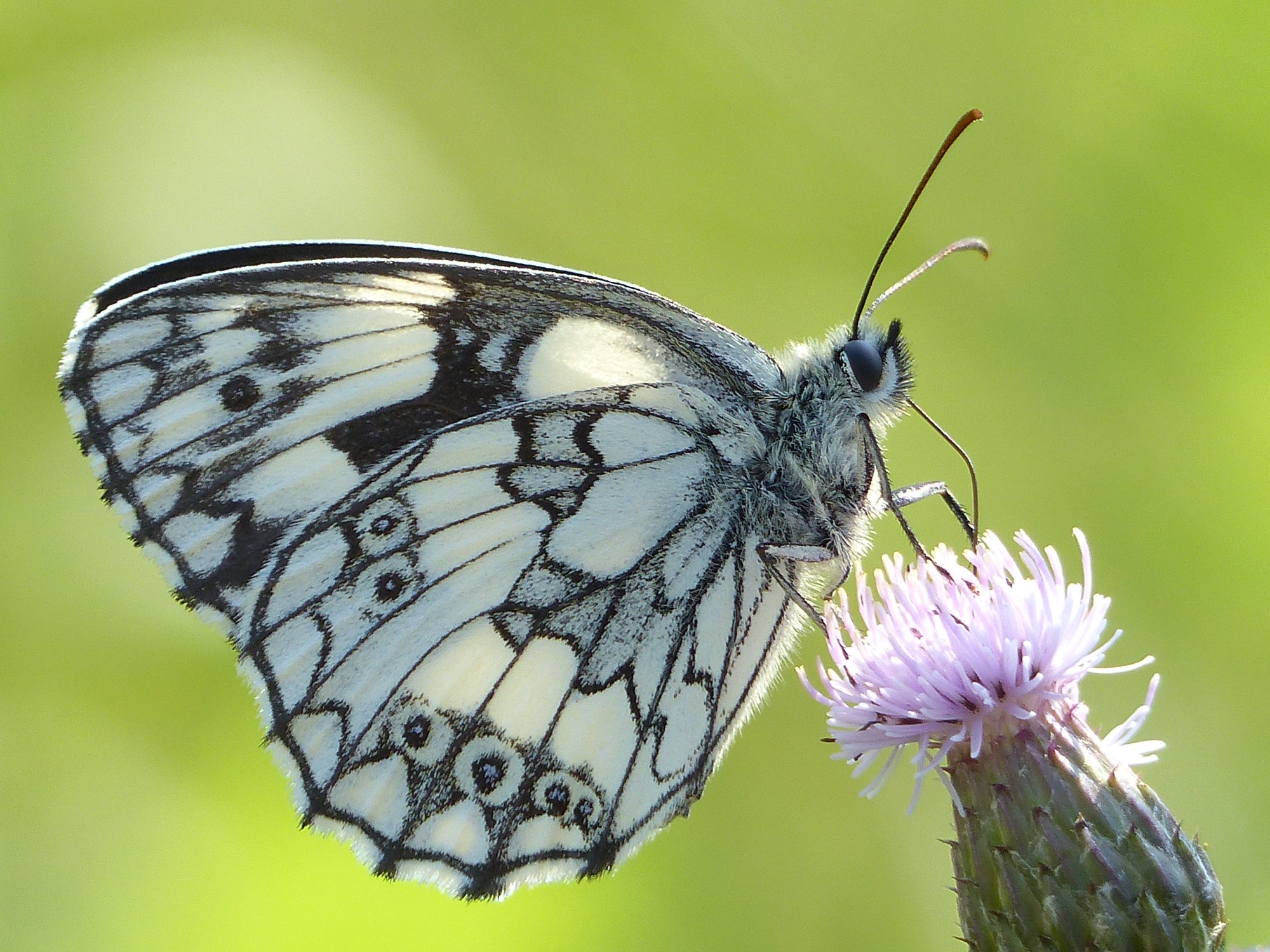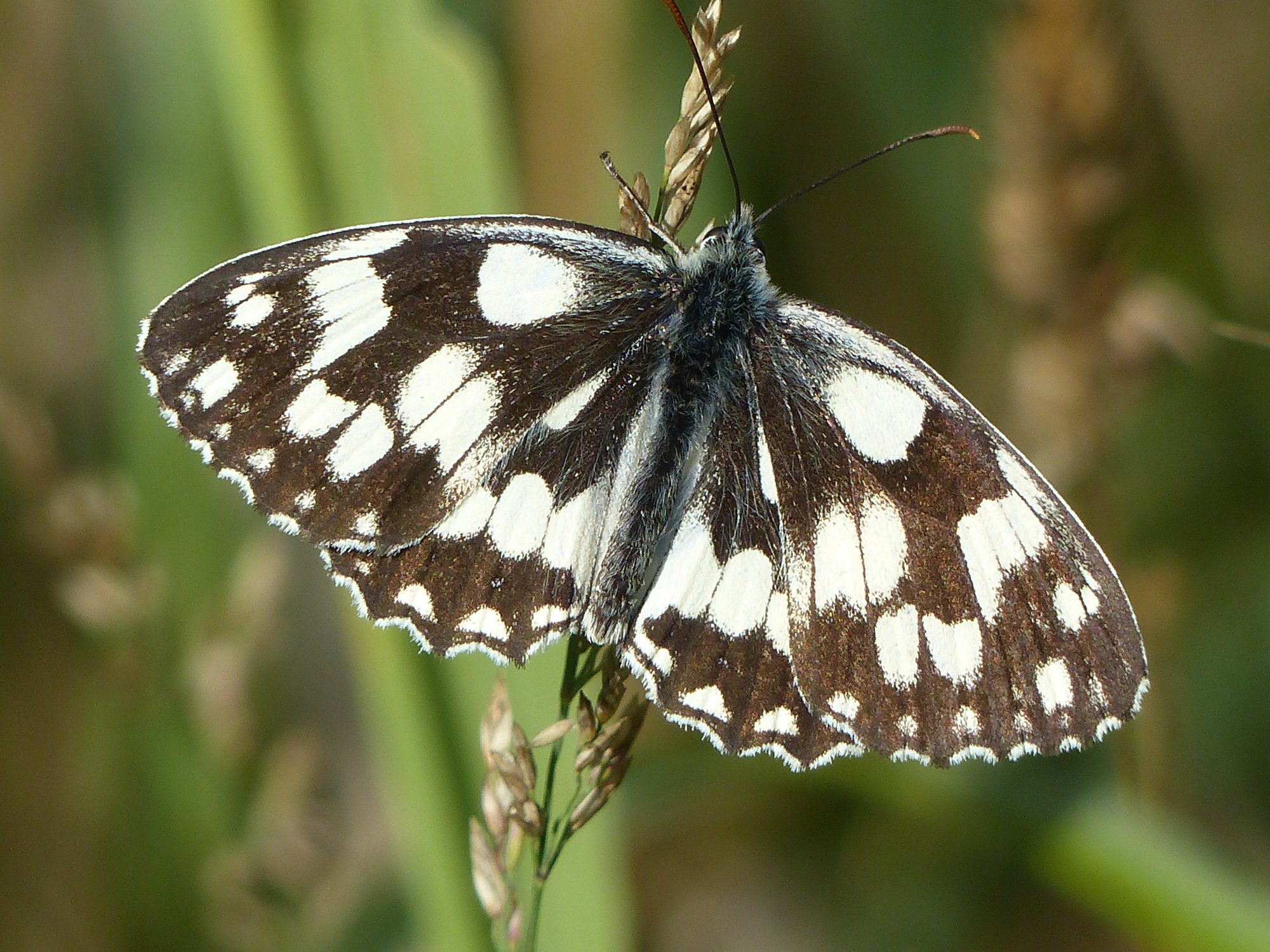 Flügeloberseiten mit schwarz-weißem Fleckenmuster (Name!), manche Individuen weißlich gelb und schwarz.