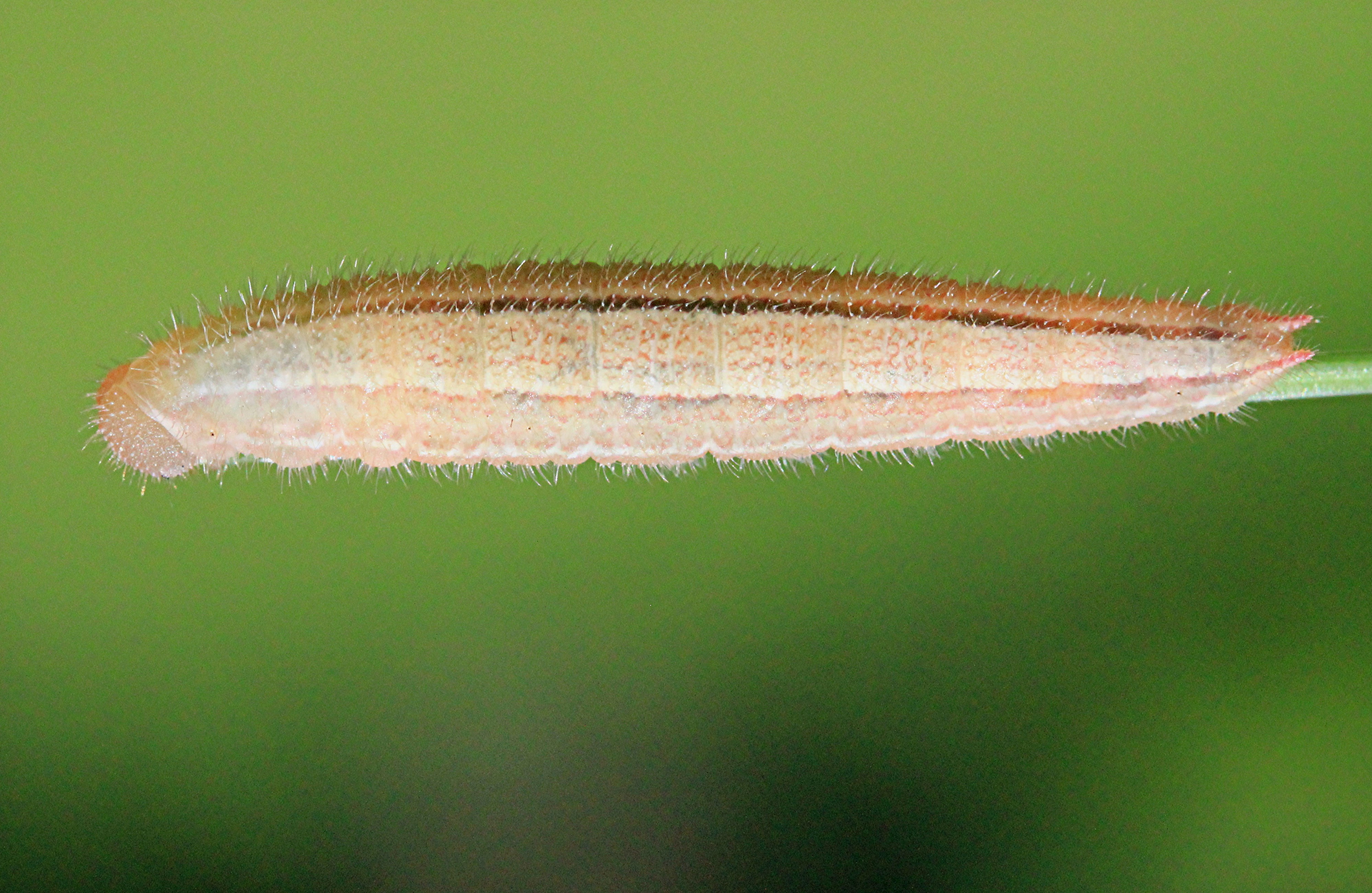 Flügelunterseiten mit gleichem Muster, das Schwarz aber deutlich schwächer ausgeprägt; Vorderflügel vor der Spitze mit einem kleinen Augenfleck; Hinterflügel vor dem Hinterrand mit einer Reihe Augenflecke.