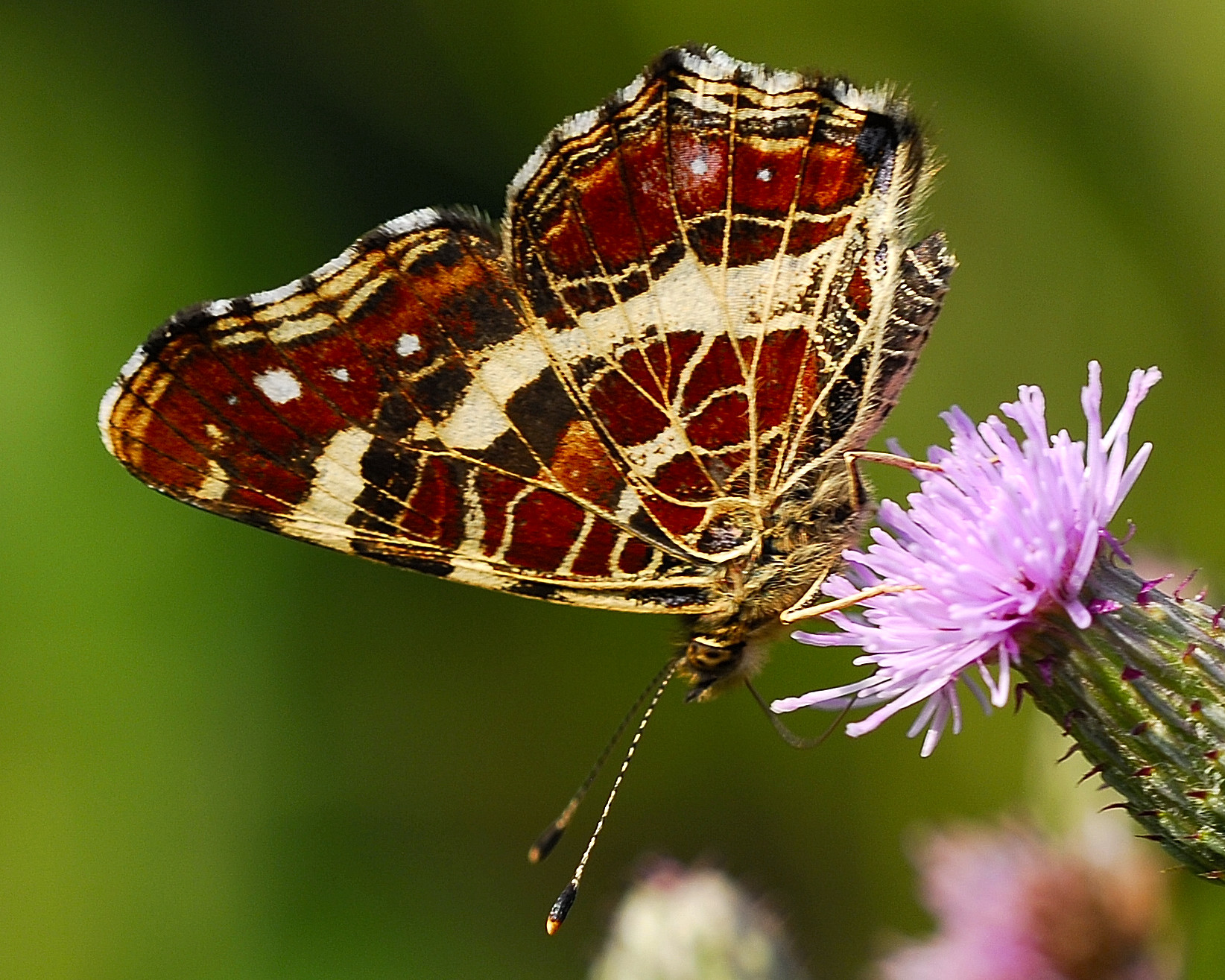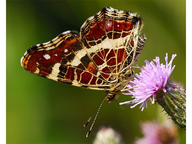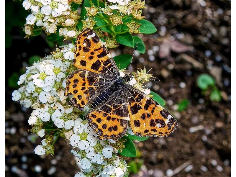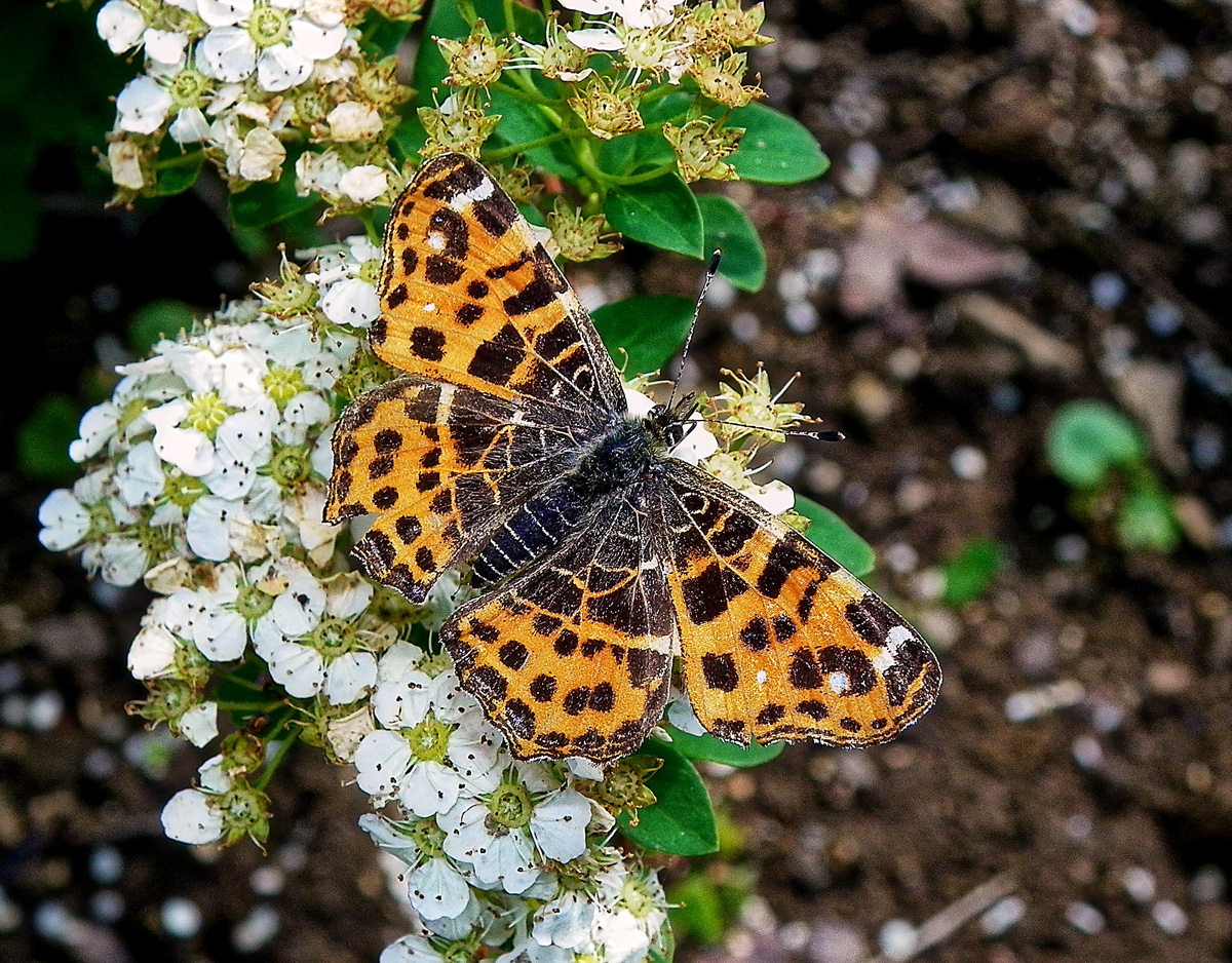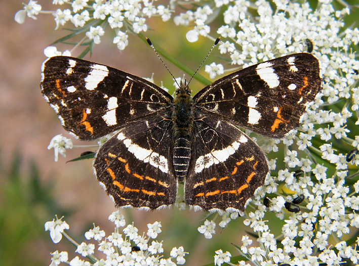 Flügeloberseiten der Frühjahrsgeneration orange mit vielen schwarzen und einzelnen weißen Flecken; Sommergeneration schwarz, mit breiter weißer Mittelbinde, die von schwarzen Adern durchzogen und im Vorderflügel in der Mitte unterbrochen ist, einzelne weiße Flecken zwischen der Mittelbinde und dem Flügelrand sowie schmale orange Bänder vor den Außenrändern. Fransen schwarz-weiß gescheckt.