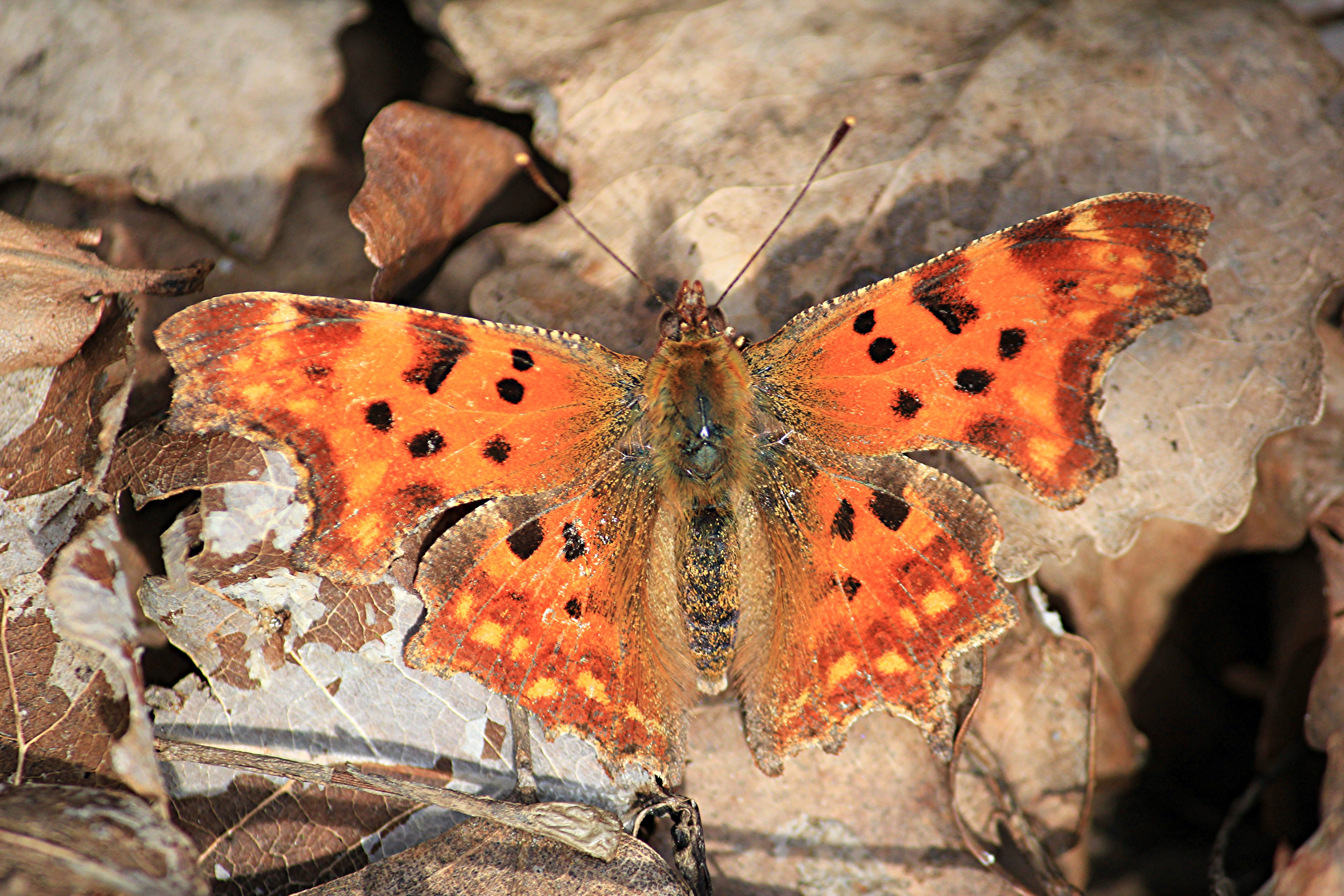 Flügeloberseiten orange mit schwarzen und dunkelbraunen Flecken.