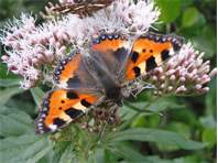 Ein Kleiner Fuchs auf einem Wasserdostblütenstand am 16. Juli 2011 in Oelsnitz/Erzgebirge