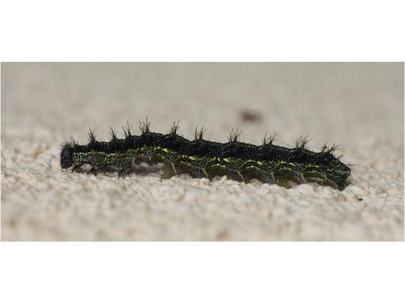 Die ausgewachsenen Larven sind deutlich bedornt, braunschwarz, mit variablen gelben Rücken- und Seitenlinien.