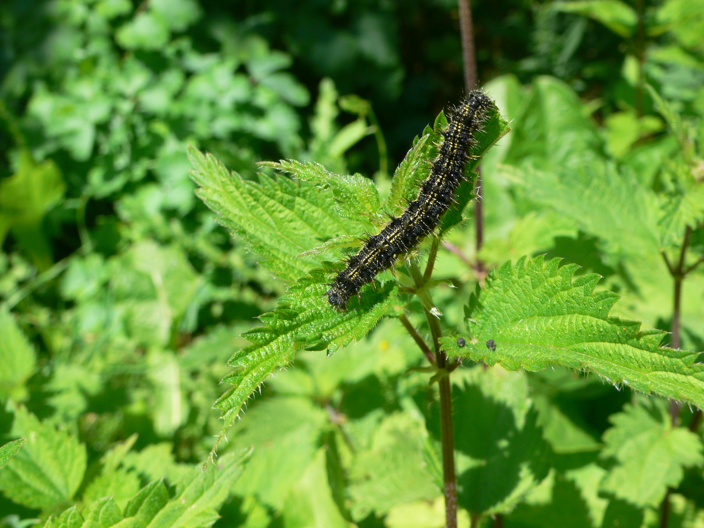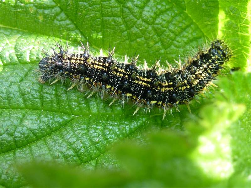 Larve vom Kleinen Fuchs im Mai 2014, an der Talsperre Wallroda im LSG Massenei