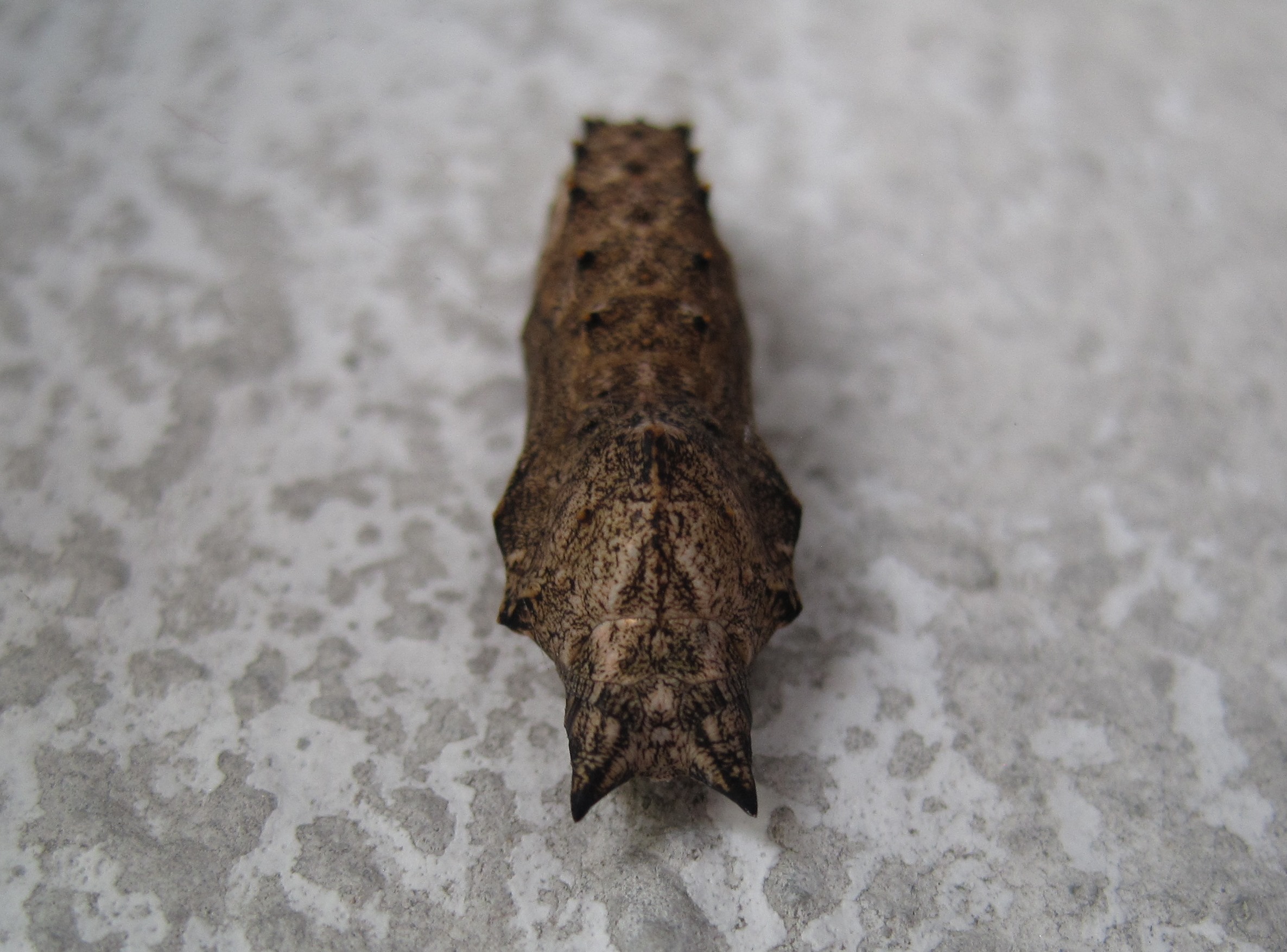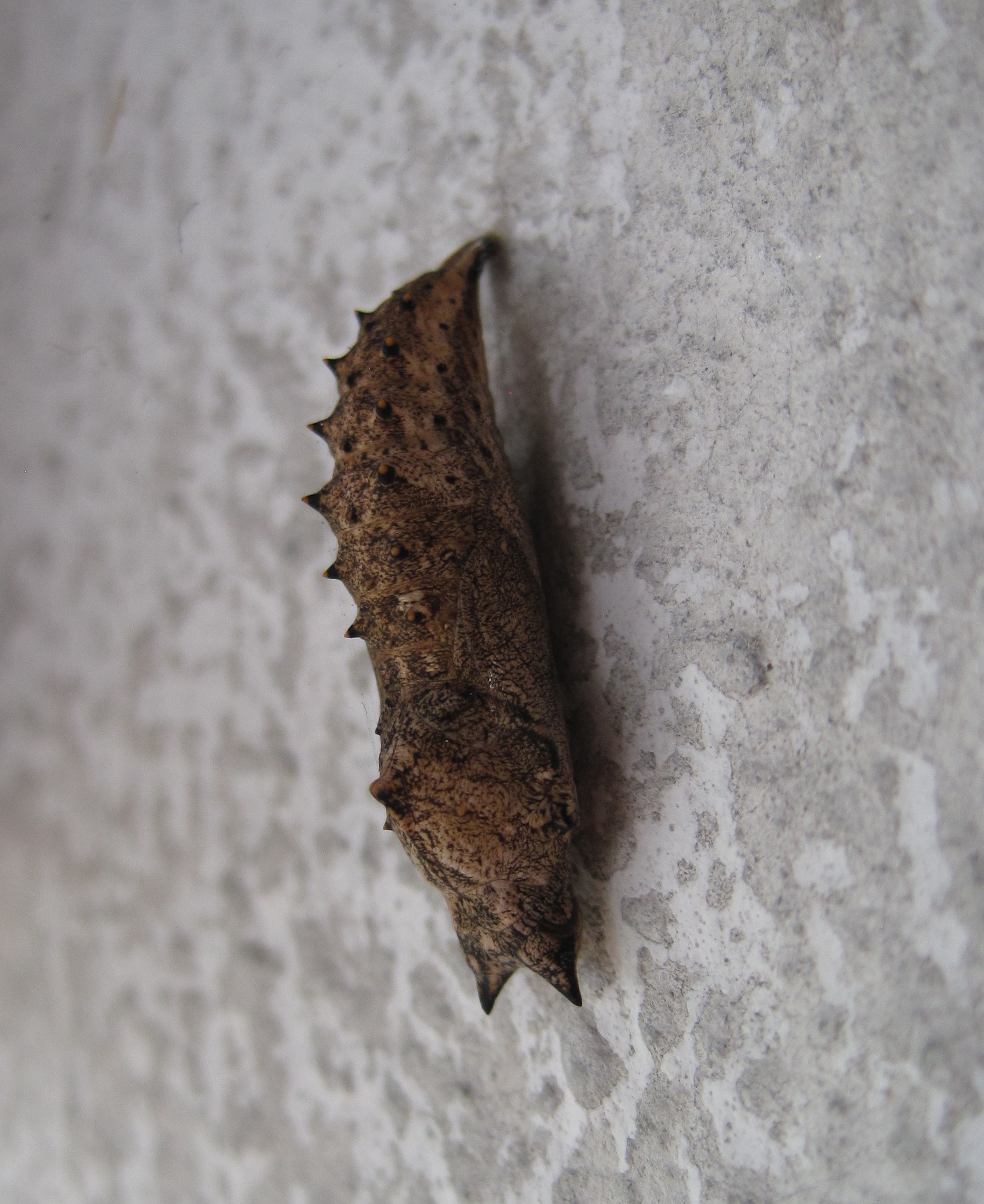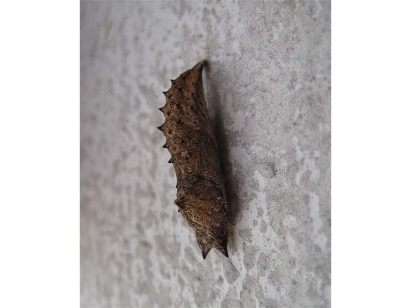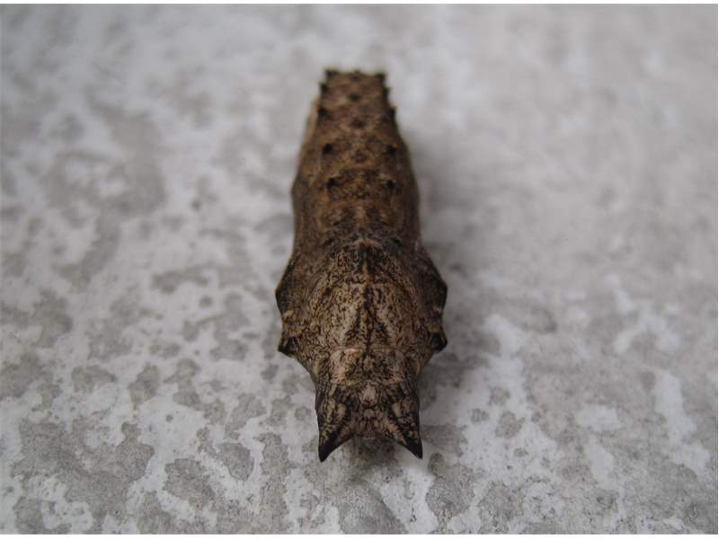 Die Puppe ist eine Stürzpuppe mit dornartigen Ausstülpungen. Ihre Färbung variiert von Dunkelgrau bis zu metallisch glänzendem Gelb.
