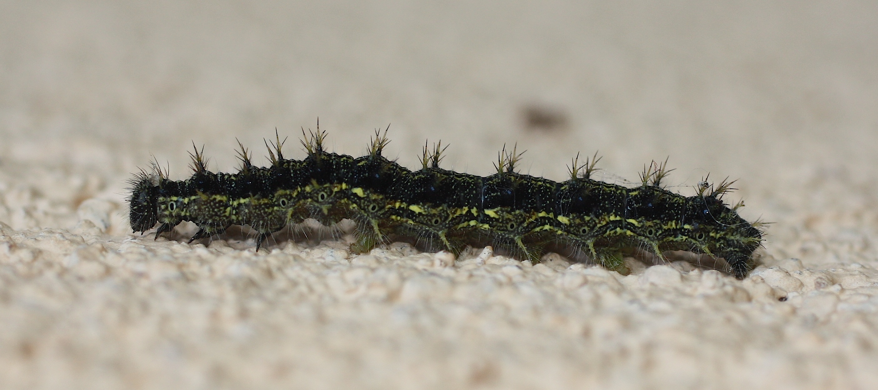 Eine von zwei Larven des Kleinen Fuchses beim Versuch, eine Hauswand zu erklimmen. Zwickau-Callenberg im Juli 2012