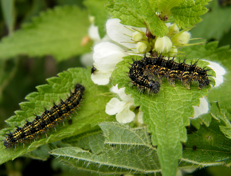 Raupen des Kleinen Fuchses auf Taubnessel am 15.05.2012 in Glashütte