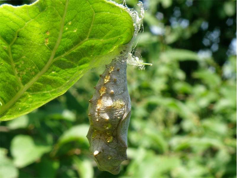 Puppe des Admirals gefunden am Blatt der Großen Klette ( Arctium lappa) (© Angela Kühne)( Bild vergrößern)