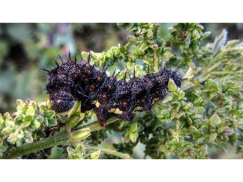 Larve des Admirals auf Brennnessel. Gemarkung Hohenprießnitz, Unterkreische, Oktober 2013. (© Michael Happ)( Bild vergrößern)
