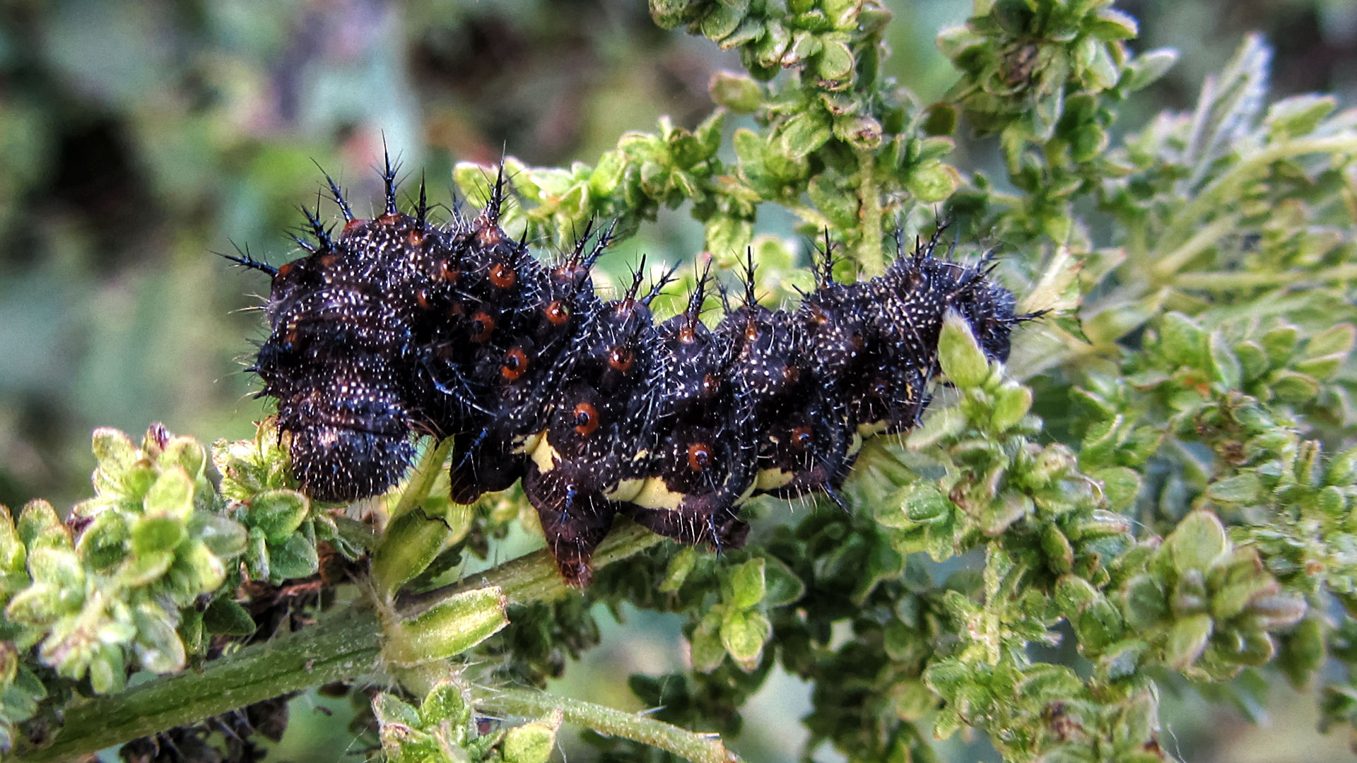 Larve des Admirals auf Brennnessel. Gemarkung Hohenprießnitz, Unterkreische, Oktober 2013.
