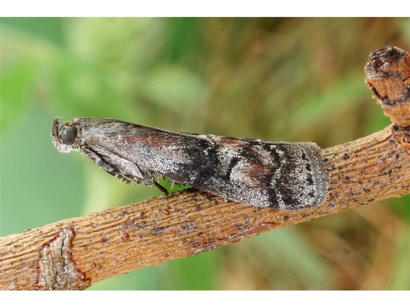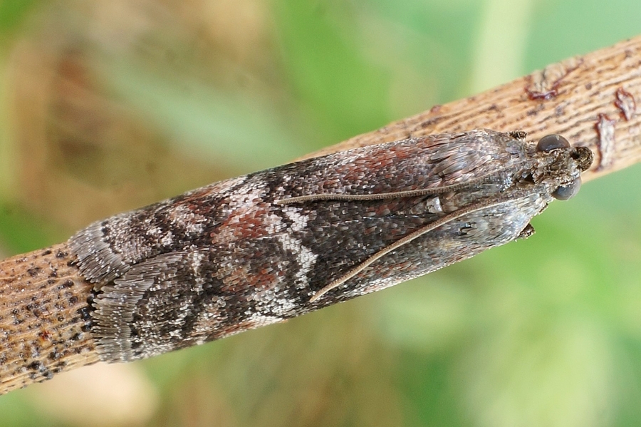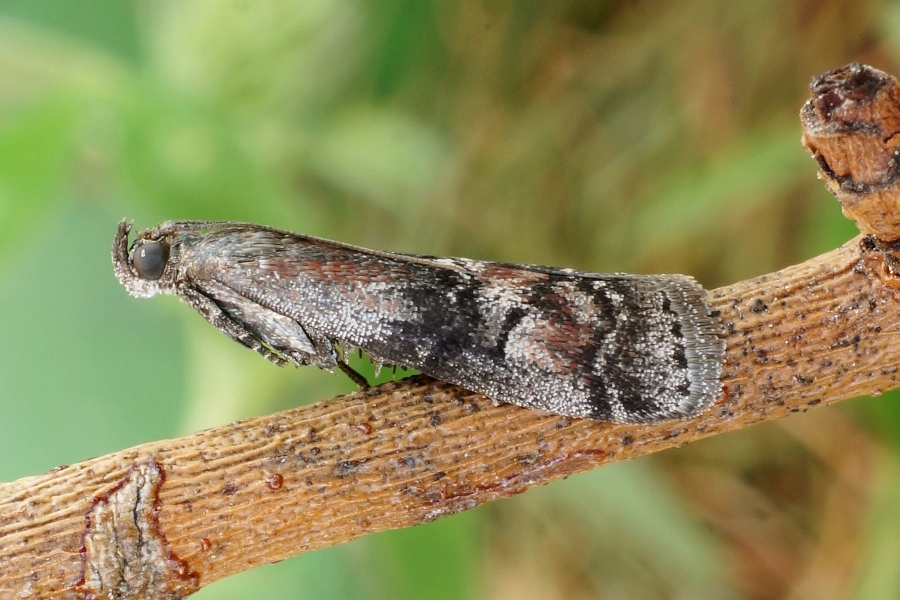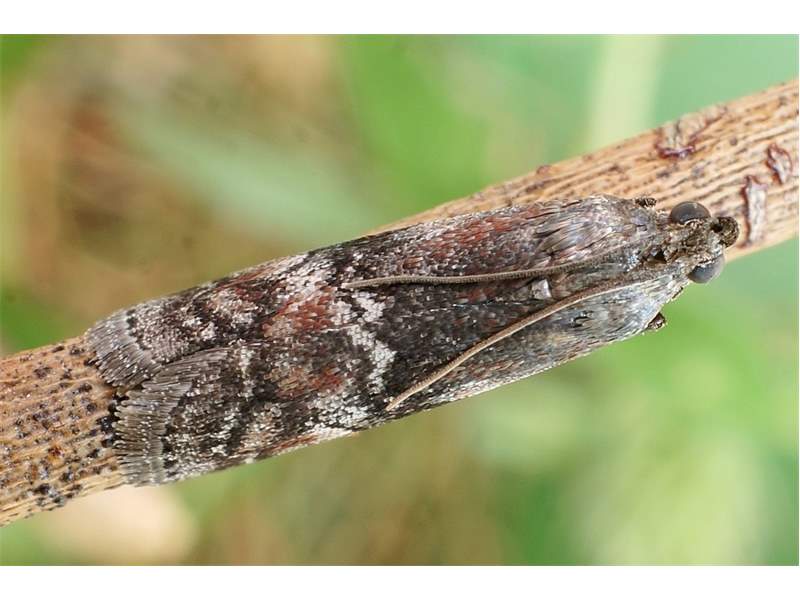 Vorderflügel bei 1/2 und 4/5 jeweils eine dünne graue Querlinie, die jeweils schwarz begrenzt ist; Basalfeld hellgrau, von der Flügelmitte bis zum Flügelhinterrand rotbraun beschuppt, breiter schwarzer Schatten entlang der inneren Querlinie; Mittelfeld hellgrau, mit rotbrauner Linie, die am Flügelhinterrand an der inneren Querlinie beginnt und sich quer über das Mittelfeld bis zur äußeren Querlinie erstreckt und noch vor dem Flügelvorderrand berührt; Mittelfeld mit schwarzem, hantelförmigem Querstrich in der Mitte.
